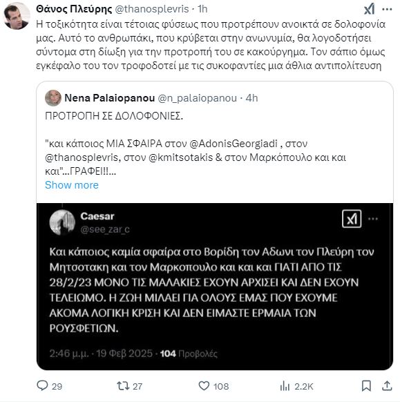 Ο χρήστης του Χ, καλούσε σε δολοφονίες των Μάκη Βορίδη, Άδωνη Γεωργιάδη, Θάνου Πλεύρη, Κυριάκου Μητσοτάκη και Δημήτρη Μαρκόπουλου.