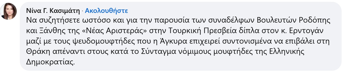 H βουλευτής Β’ Πειραιά του ΣΥΡΙΖΑ σχολίασε: «Να συζητήσετε ωστόσο και για την παρουσία των συναδέλφων Βουλευτών Ροδόπης και Ξάνθης της «Νέας Αριστεράς» στην Τουρκική Πρεσβεία δίπλα στον κ. Ερντογάν μαζί με τους ψευδομουφτήδες που η Άγκυρα επιχειρεί συντονισμένα να επιβάλει στη Θράκη απέναντι στους κατά το Σύνταγμα νόμιμους μουφτήδες της Ελληνικής Δημοκρατίας».