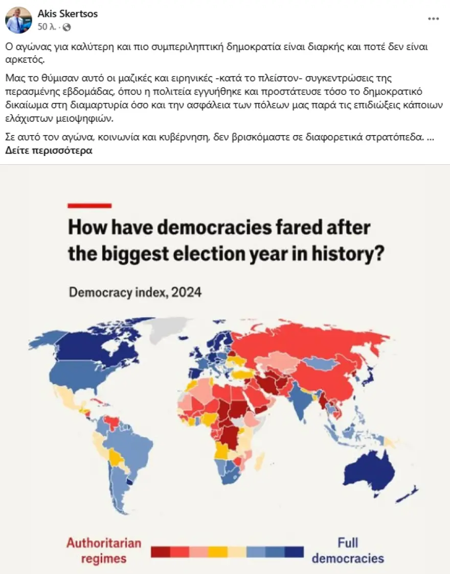 Η Ελλάδα, είναι μια από τις μόλις 25 χώρες παγκοσμίως με πλήρη δημοκρατία αναφέρει ο υπουργός Επικρατείας Ακης Σκέρτσος σύμφωνα και με την τελευταία έκθεση του Economist