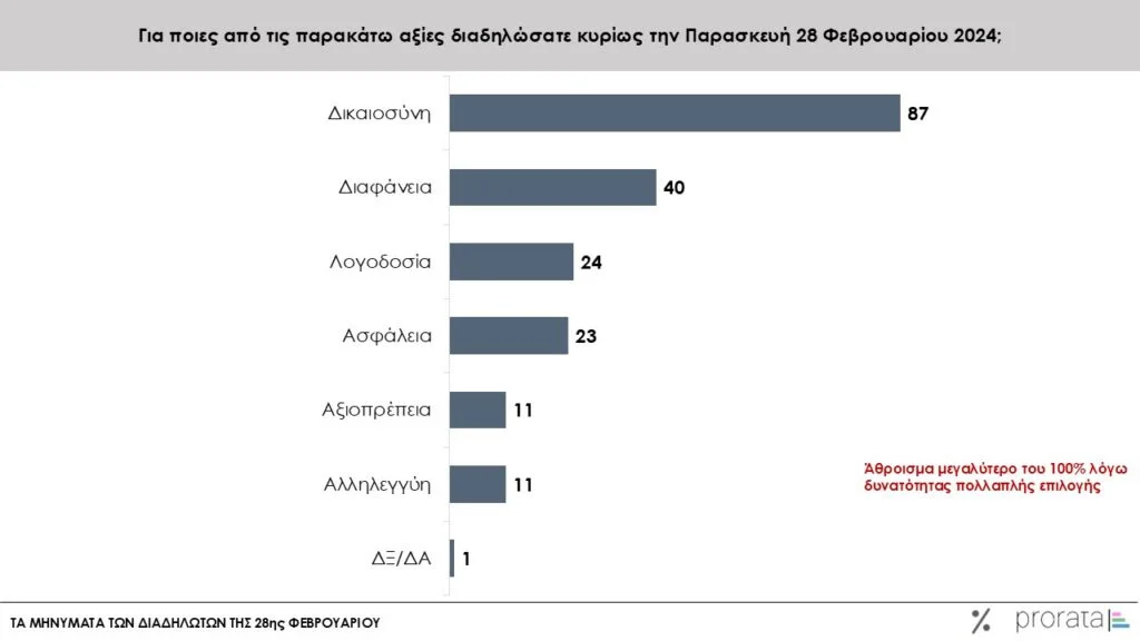 Σχετικά με τις αξίες βάσει των οποίων κινητοποιήθηκαν οι διαδηλωτές, η «Δικαιοσύνη» κυριαρχεί (87%), ενώ ακολουθούν η «Διαφάνεια» (40%), η «Λογοδοσία» (24%), η «Ασφάλεια» (23%), και η «Αξιοπρέπεια» και «Αλληλεγγύη» με 11% αντίστοιχα.