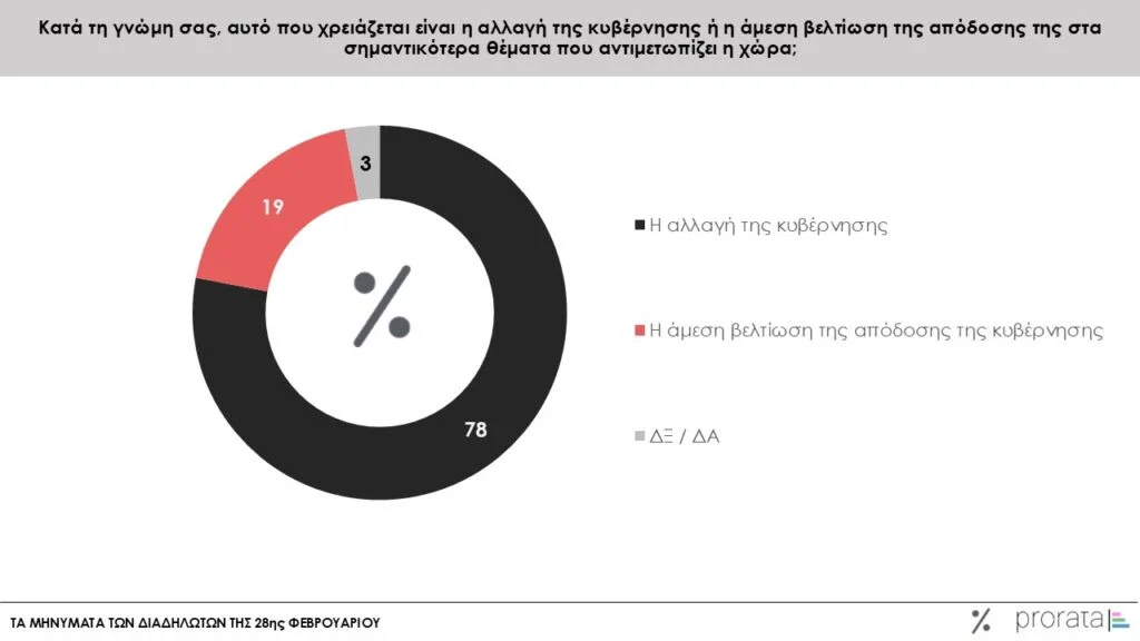 Τέλος, σε σχέση με το τι πιστεύουν οι συμμετέχοντες ότι χρειάζεται η χώρα, το 78% προκρίνει την «αλλαγή της κυβέρνησης», με το 19% να προτιμά «άμεση βελτίωση της απόδοσης της κυβέρνησης», ενώ μόλις το 3% δεν εξέφρασε άποψη.