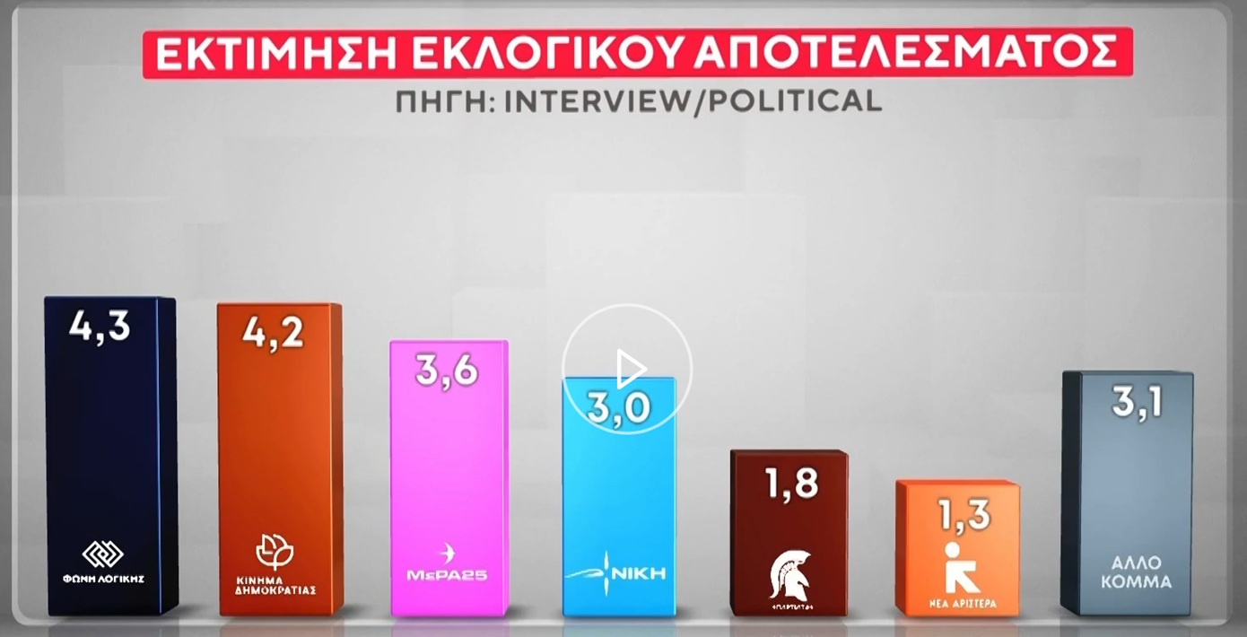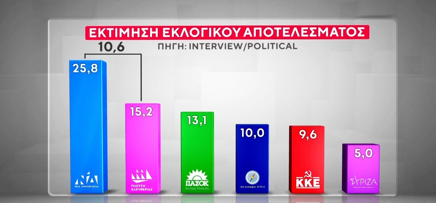 Η Νέα Δημοκρατία παραμένει στην πρώτη θέση με σημαντική διαφορά από το δεύτερο κόμμα, σύμφωνα με τη νέα δημοσκόπηση της εταιρείας Interview για την εφημερίδα Political. Το κυβερνών κόμμα καταγράφει ποσοστό 25,8% στην εκτίμηση του εκλογικού αποτελέσματος, ενώ η Πλεύση Ελευθερίας της Ζωής Κωνσταντοπούλου ακολουθεί στη δεύτερη θέση με 15,2%.