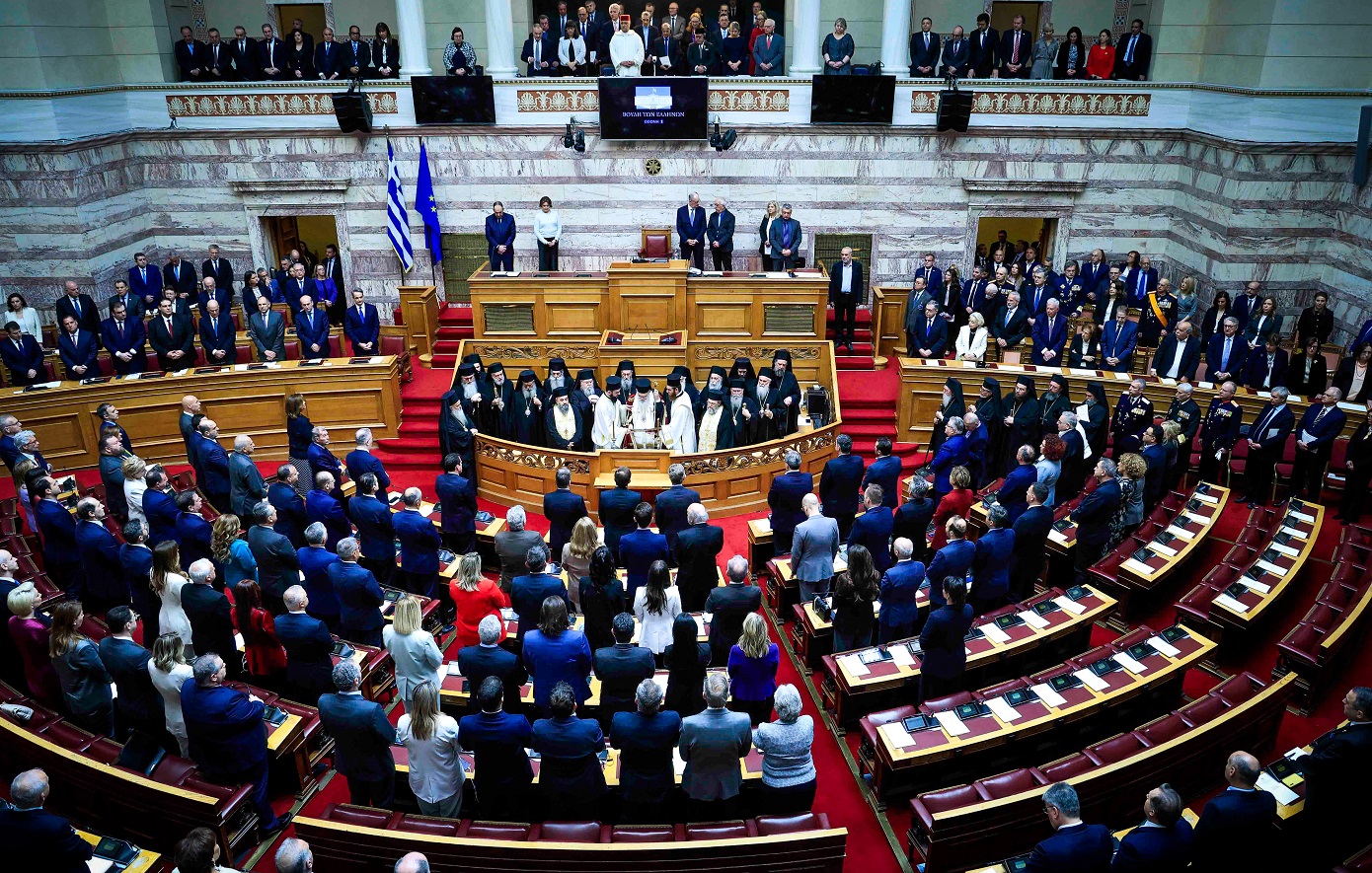 Ακολούθησε δοξολογία, με τον Κώστα Τασούλα να στέκεται δίπλα στον πρωθυπουργό Κυριάκο Μητσοτάκη και τον πρόεδρο της Βουλής Νικήτα Κακλαμάνη, δίπλα στα έδρανα του προεδρείου του Σώματος.