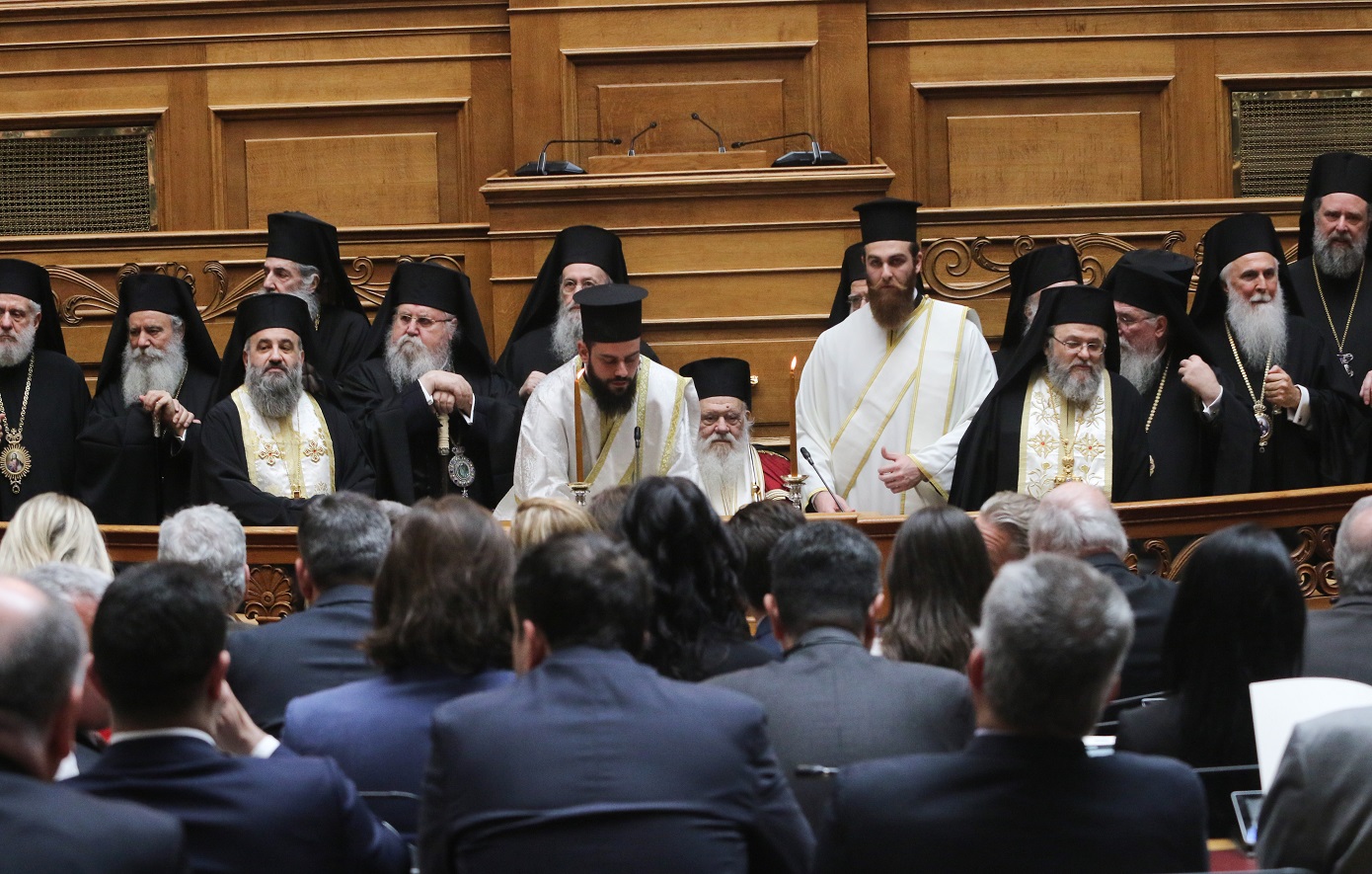 Το κόκκινο χαλί για τους επισήμους είχε ήδη στρωθεί από χθες, όπως και οι τηλεοπτικές κάμερες του Καναλιού της Βουλής, που στήθηκαν τόσο γύρω από τον προαύλιο χώρο, όσο και στους διαδρόμους του Κοινοβουλίου. Στις 11:13, ο Αρχιεπίσκοπος Ιερώνυμος και τα μέλη της Ιεράς Συνόδου εισήλθαν στην Ολομέλεια, συνοδευόμενοι από τον Β΄ αντιπρόεδρο της Βουλής Γιώργο Γεωργαντά.