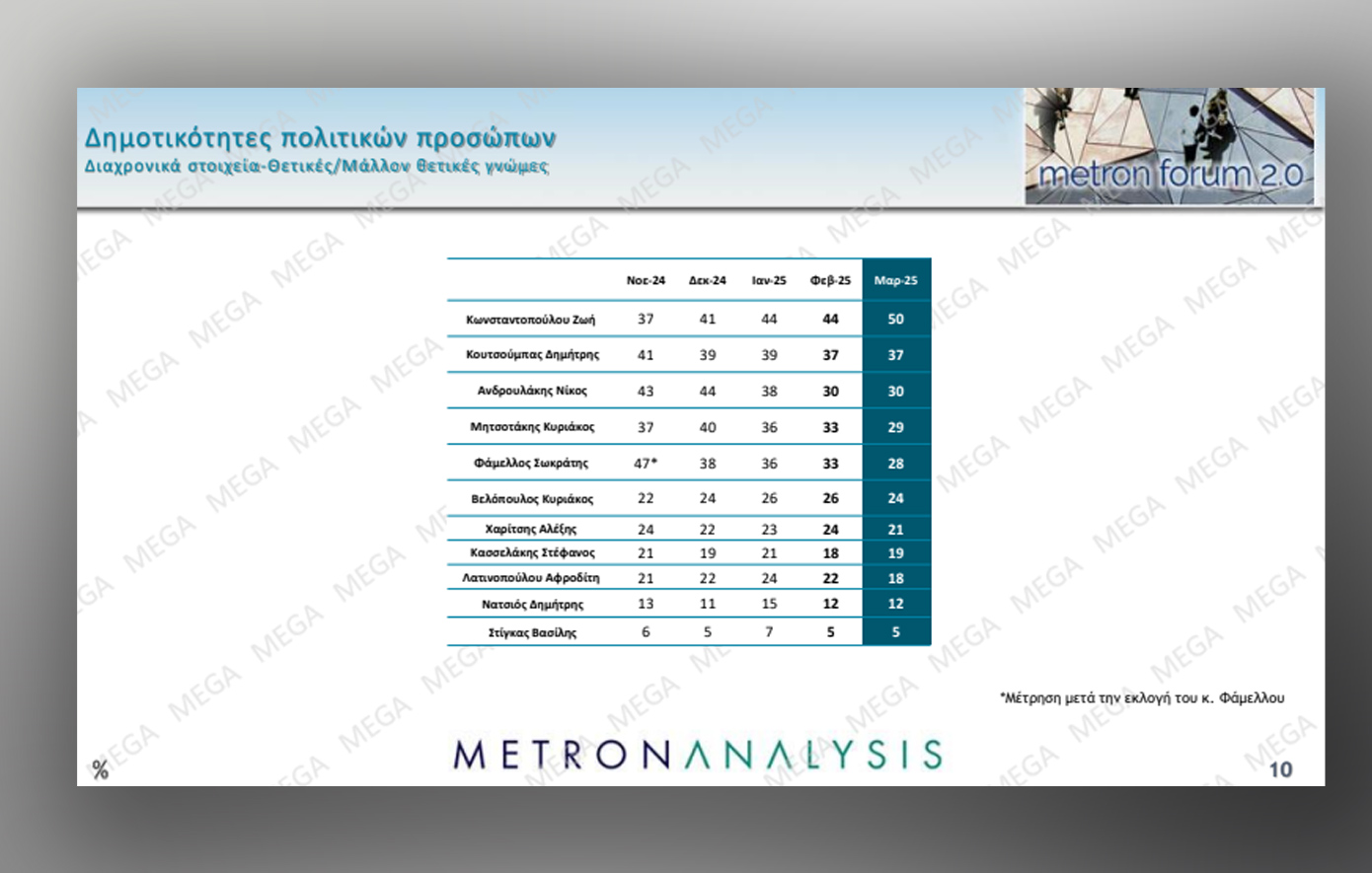 Σύμφωνα με τη Metron Analysis για το Mega, η αρχηγός της Πλεύσης Ελευθερίας συγκεντρώνει 50% στη δημοφιλία των πολιτικών αρχηγών και είναι πρώτη, με τον Νίκο Ανδρουλάκη να έρχεται τρίτος με 30%.