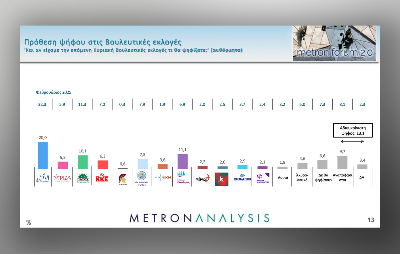 Η Metron Analysis δείχνει μια «φυσιολογική» εικόνα για τα υπόλοιπα κόμματα, που διαμορφώνεται ως εξής: