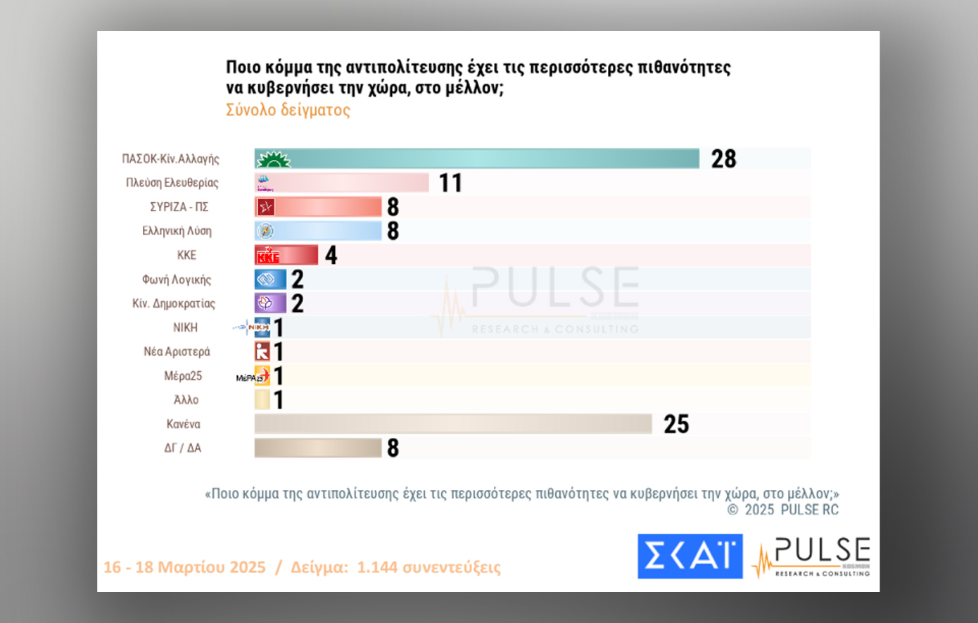 Ωστόσο, στην έρευνα της Pulse για τον ΣΚΑΪ στο ερώτημα «ποιο κόμμα της αντιπολίτευσης μπορεί να γίνει κυβέρνηση», το ΠΑΣΟΚ λαμβάνει 28%, έναντι της Πλεύσης Ελευθερίας που παίρνει 11%.