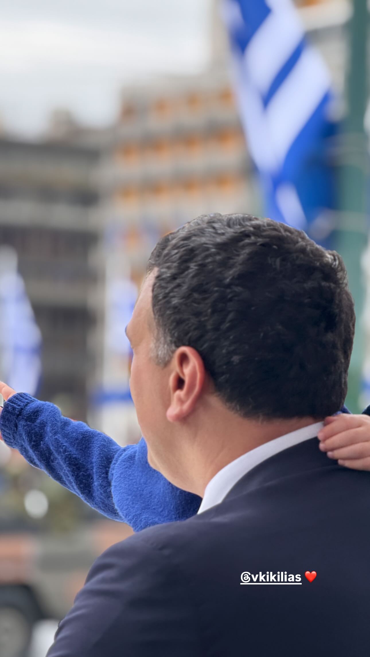 Μια τρυφερή στιγμή του Βασίλη Κικίλια με τον γιο του, Παναγιώτη Αντώνιο, ο οποίος ήταν ενθουσιασμένος με την παρέλαση, απαθανάτισε η Τζένη Μπαλατσινού η οποία πρόσφατα επέστρεψε από την Πάτμο και ανέβασε την φωτογραφία στον προσωπικό της λογαριασμό στο Instagram