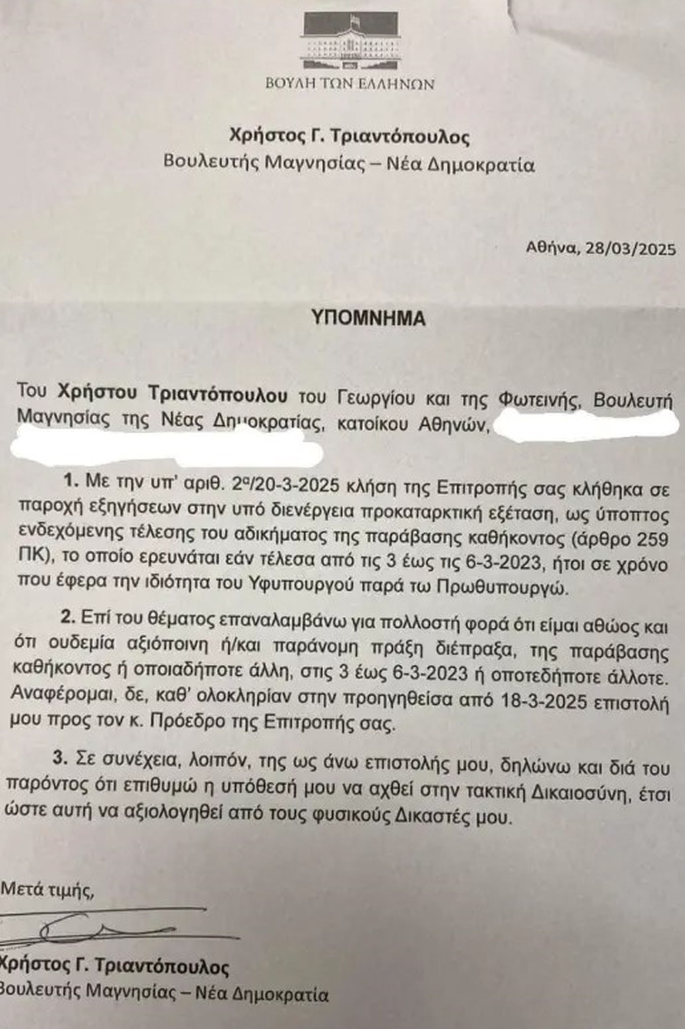 «1. Με την υπ’ αριθ. 2°/20-3-2025 κλήση της Επιτροπής σας κλήθηκα σε παροχή εξηγήσεων στην υπό διενέργεια προκαταρκτική εξέταση, ως ύποπτος ενδεχόμενης τέλεσης του αδικήματος της παράβασης καθήκοντος (άρθρο 259 ΠΚ), το οποίο ερευνάται εάν τέλεσα από τις 3 έως τις 6-3-2023, ήτοι σε χρόνο που έφερα την ιδιότητα του Υφυπουργού παρά τω Πρωθυπουργώ.