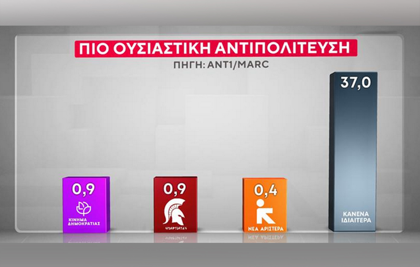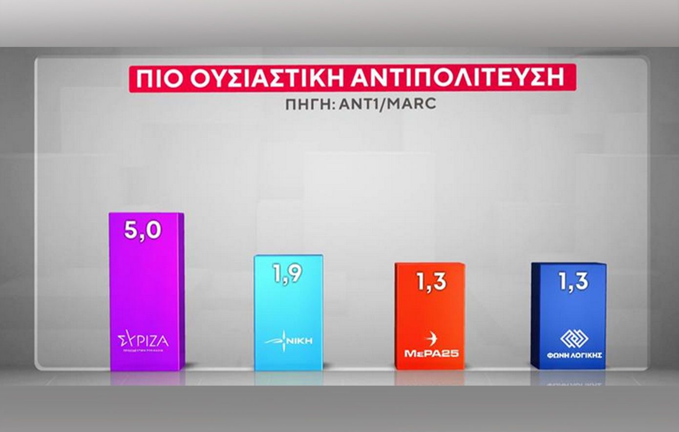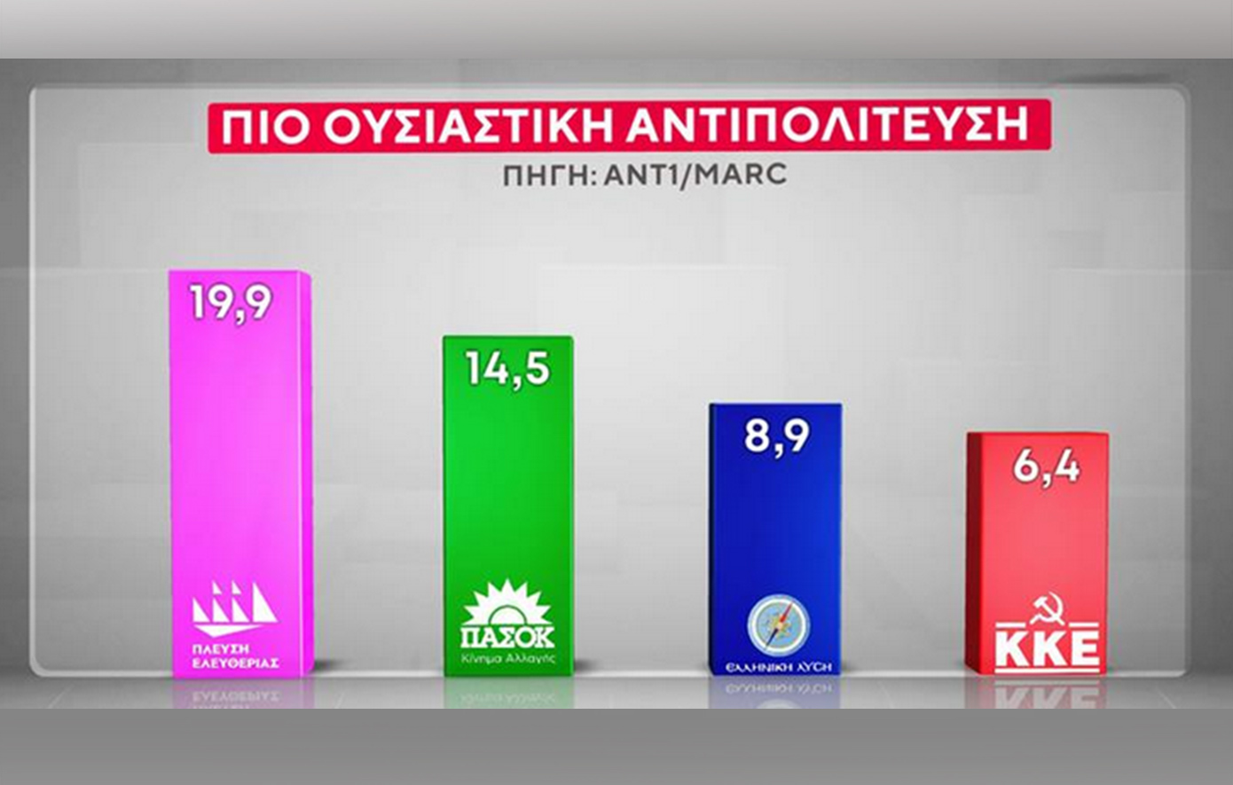 Σε ερώτημα για την πιο «ουσιαστική αντιπολίτευση» η Πλεύση Ελευθερίας προηγείται με 19,9%, το ΠΑΣΟΚ ακολουθεί με 14,5%, η Ελληνική Λύση με 8,9%, το ΚΚΕ με 6,4%, ο ΣΥΡΙΖΑ με 5%, η Νίκη με 1,9%, το ΜέΡΑ25 με 1,3%, η Φωνή Λογικής με 1,3%, το Κίνημα Δημοκρατίας 0,9% και η Νέα Αριστερά 0,4%.