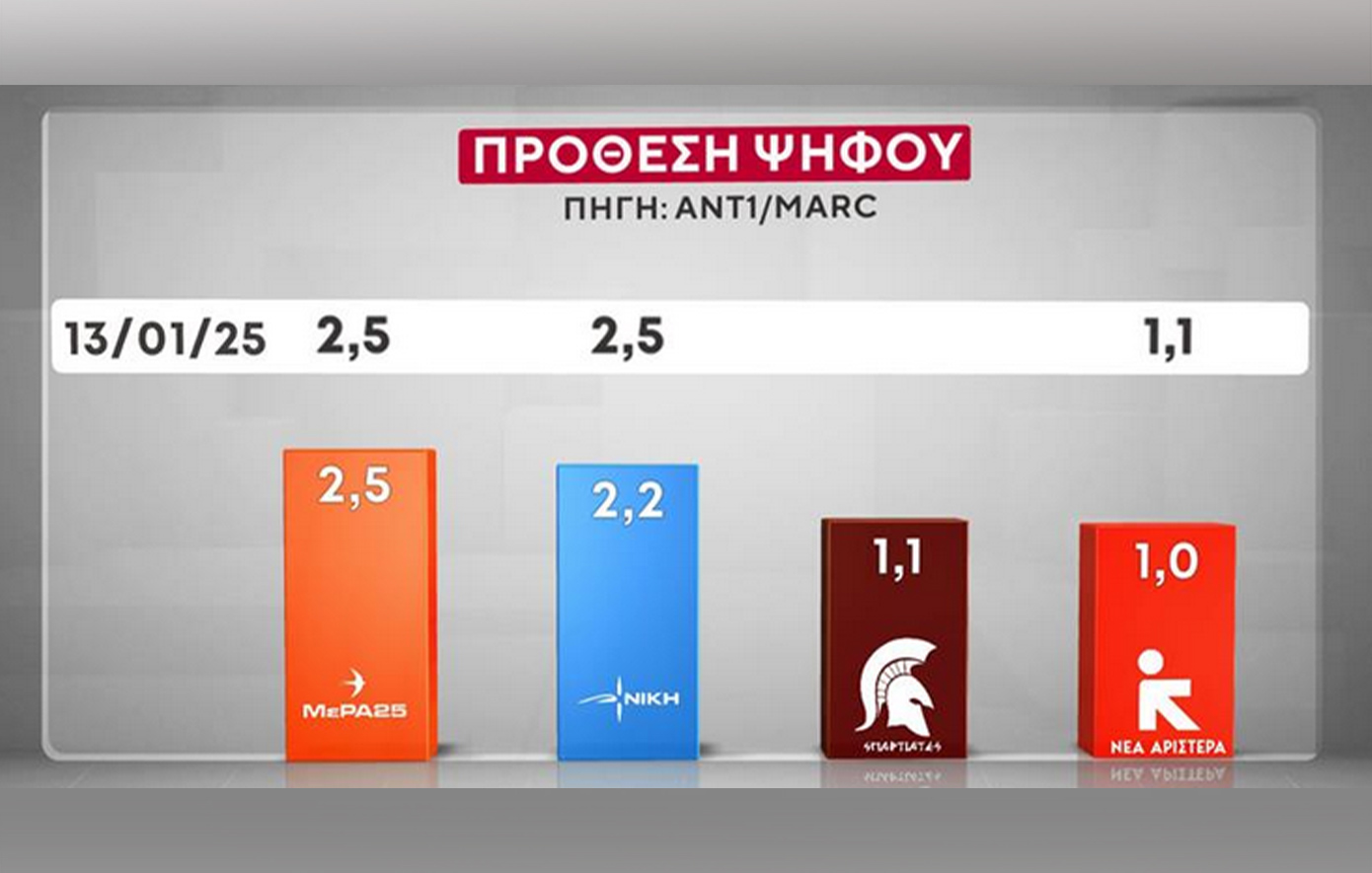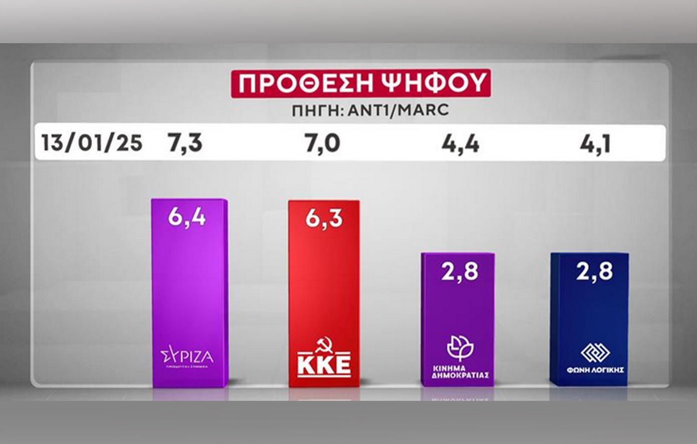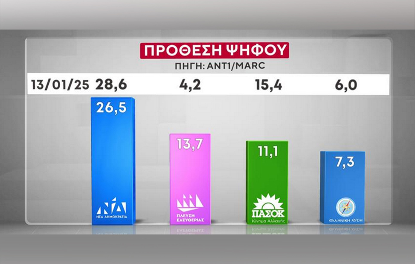 Στην πρόθεση ψήφου της έρευνα, η Νέα Δημοκρατία καταγράφεται στο 26,5% και ακολουθεί η Πλεύση Ελευθερίας με 13,7%. Το ΠΑΣΟΚ στο 11,1%, η Ελληνική Λύση στο 7,3%, Ο ΣΥΡΙΖΑ στο 6,4%, το ΚΚΕ στο 6,3%, το Κίνημα Δημοκρατίας και η Φωνή Λογικής στο 2,8%, το ΜέΡΑ25 στο 2,5%, η Νίκη στο 2,2%, οι Σπαρτιάτες 1,1% και η Νέα Αριστερά στο 1%.
