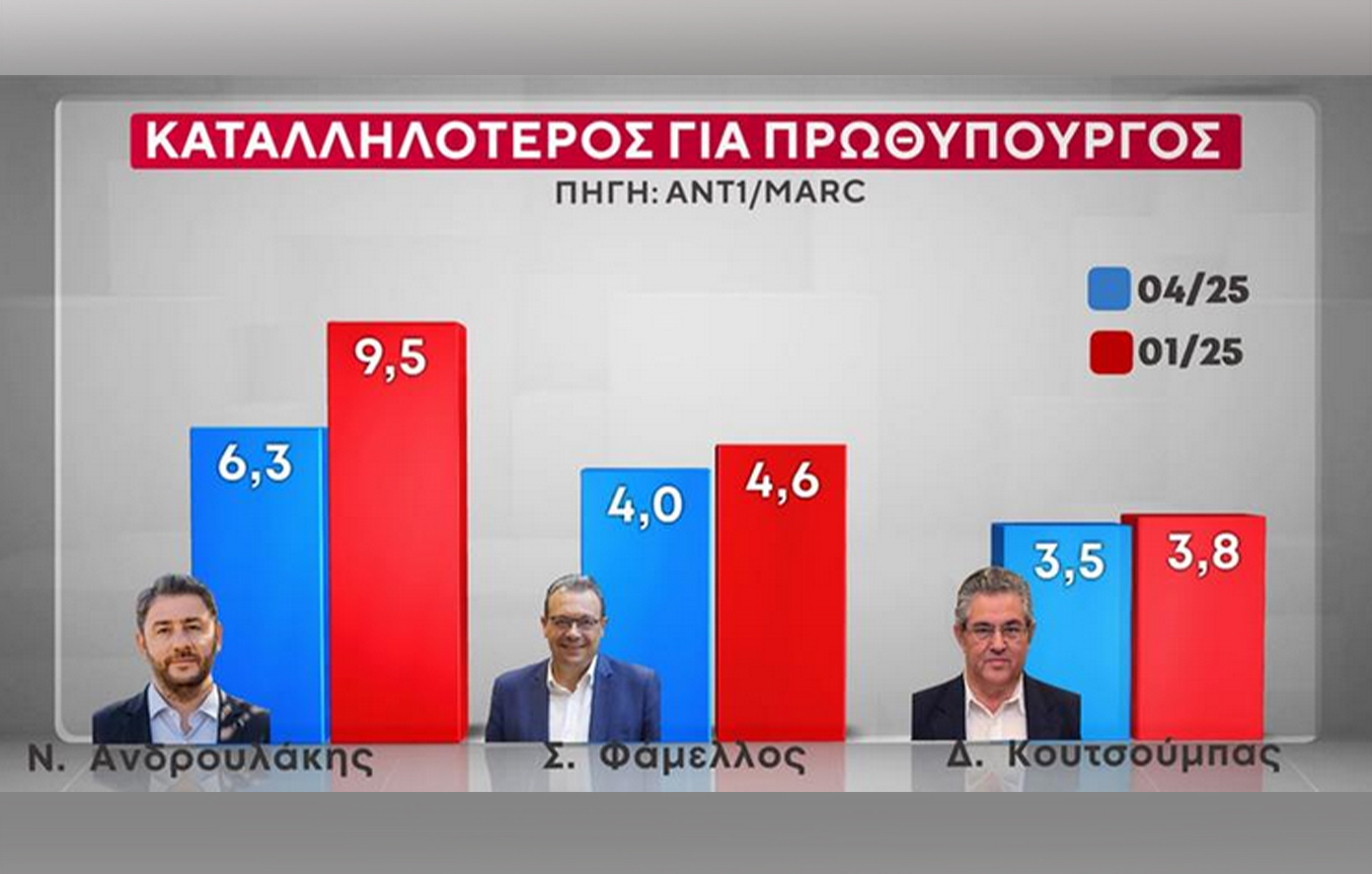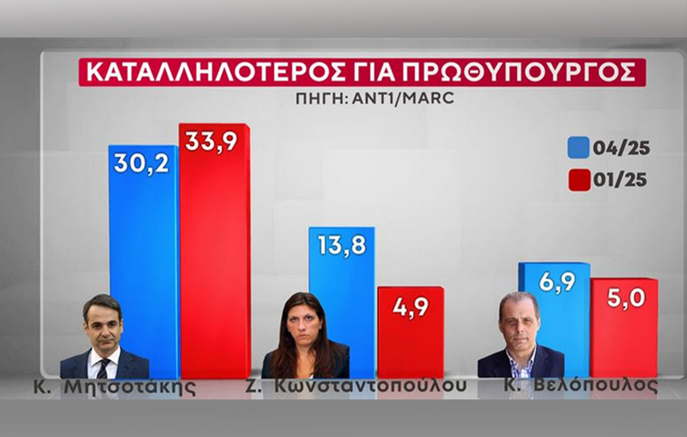 Στην ερώτηση για την καταλληλότητα για την πρωθυπουργία, ο Κυριάκος Μητσοτάκης παραμένει πρώτος με 30,2%, ακολουθεί η Ζωή Κωνσταντοπούλου με 13,8%, ο Κυριάκος Βελόπουλος 6,9%, ο Νίκος Ανδρουλάκης 6,3%, ο Σωκράτης Φάμελλος 4%, ο Δημήτρης Κουτσούμπας 3,5%, ο Στέφανος Κασσελάκης 3%, η Αφροδίτη Λατινοπούλου 2,7%, ο Γιάνης Βαρουφάκης 2,4%, ο Δημήτρης Νατσιός, Βασίλης Στίγκας 0,5%, Αλέξης Χαρίτσης 0,4%.