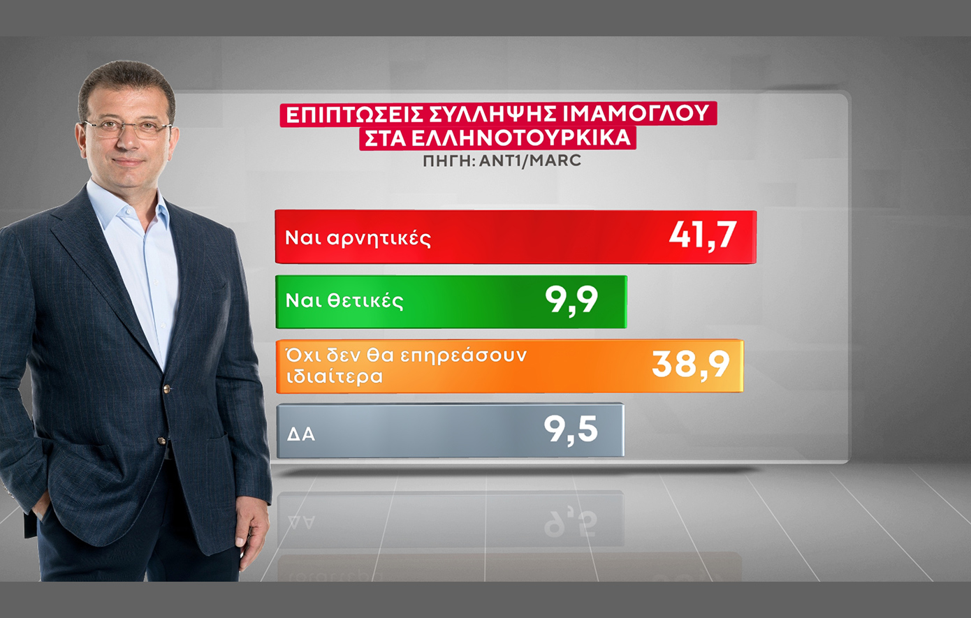 Τέλος σε ερώτηση σχετικά με τις επιπτώσεις της σύλληψης του Εκρέμ Ιμάμογλου στα ελληνοτουρκικά, το 41,7% πιστεύει πως θα υπάρξουν αρνητικές συνέπειες και το 9,9% θετικές, ενώ το 38,9% απαντά πως δεν θα επηρεαστούν ιδιαίτερα».