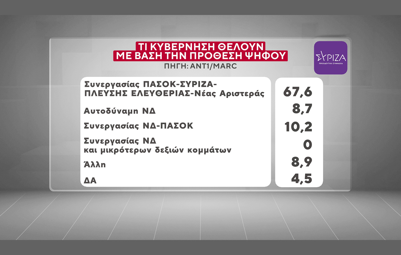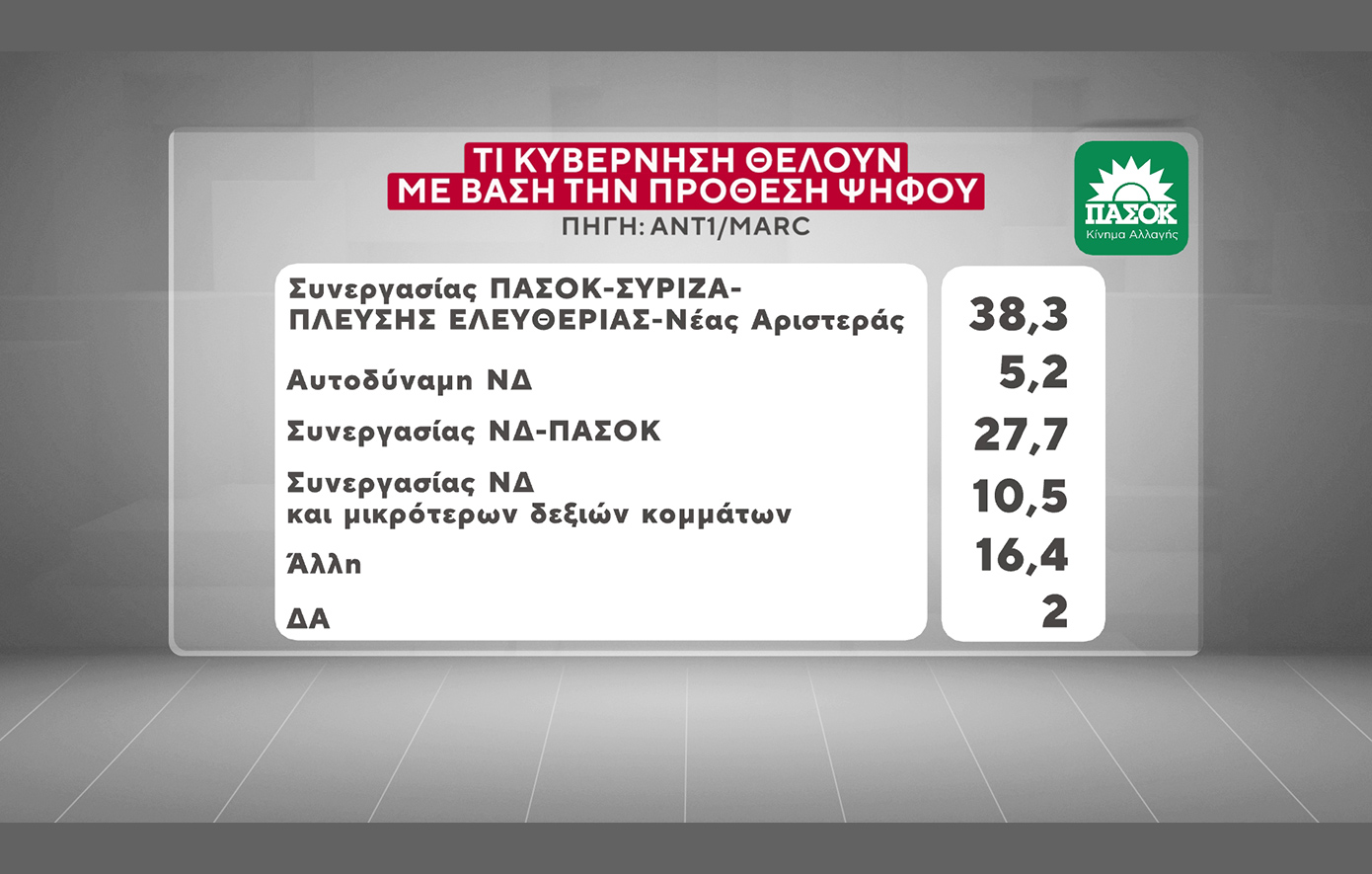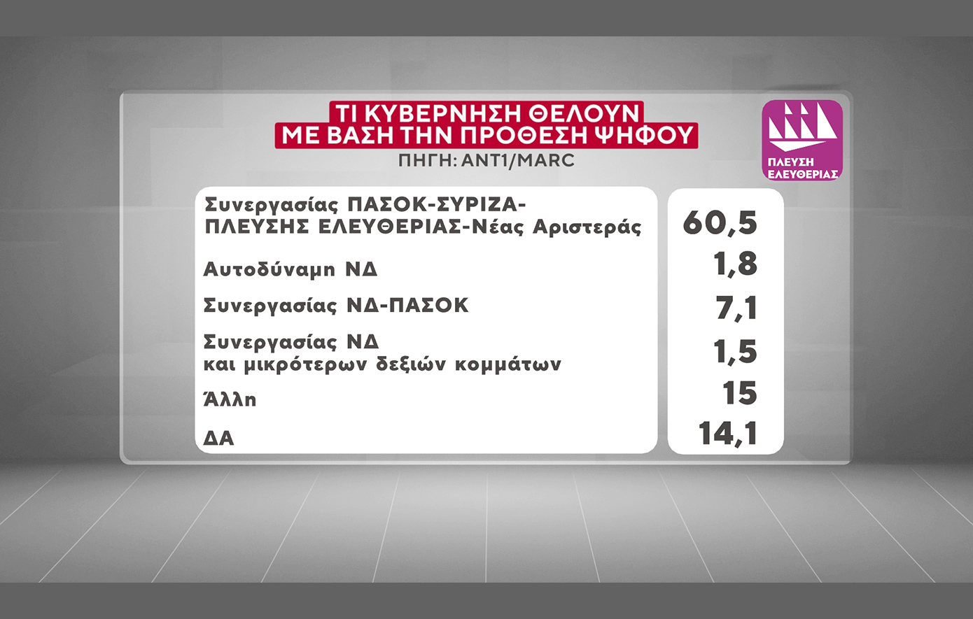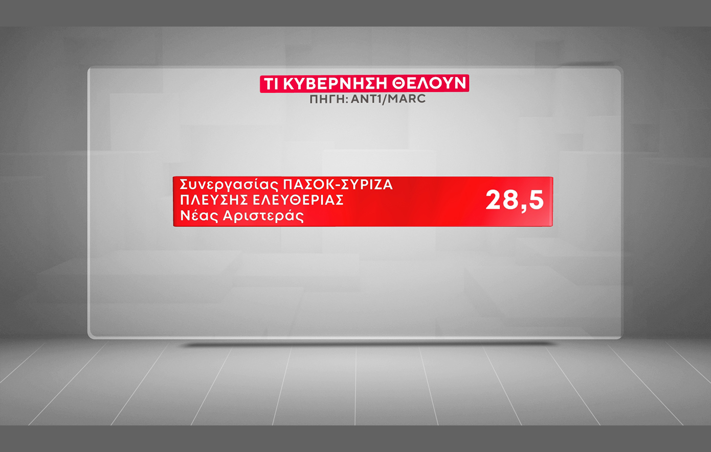 Στην ερώτηση «τι κυβέρνηση θέλετε;» το 28,5% απαντά «κυβέρνηση συνεργασίας με συμμετοχή ΠΑΣΟΚ – ΣΥΡΙΖΑ – Πλεύσης Ελευθερίας και Νέας Αριστεράς», επιλογή την οποία στηρίζει:
