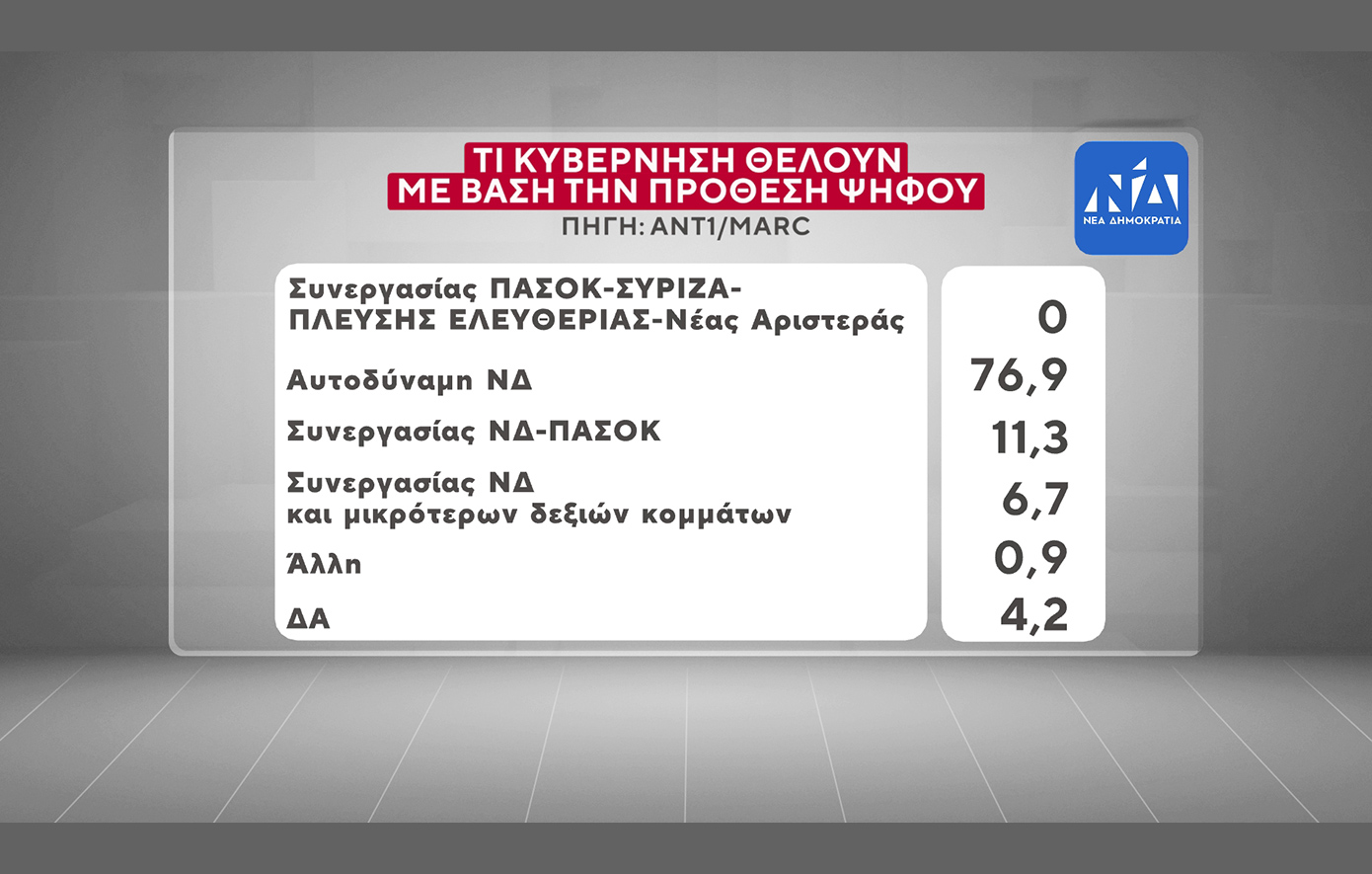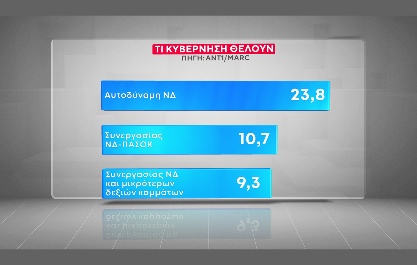 Αυτοδύναμη Νέα Δημοκρατία θέλει το 23,8% των πολιτών, επιλογή την οποία στηρίζει το 76,9% των ψηφοφόρων της Νέας Δημοκρατίας. Κυβέρνηση «συνεργασίας Νέας Δημοκρατίας και ΠΑΣΟΚ» θέλει το 10,7% των ερωτηθέντων, επιλογή που κάνει το 27,7% των ψηφοφόρων του ΠΑΣΟΚ.