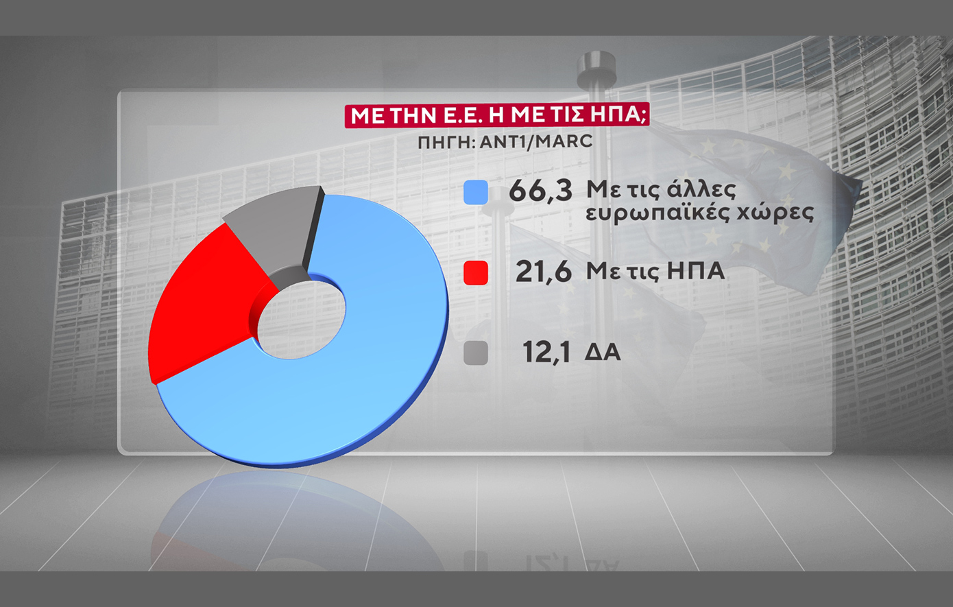 Σε δίλημμα «με την Ευρωπαϊκή Ένωση» ή «με τις ΗΠΑ», το 66,3% απαντά «με τις άλλες ευρωπαϊκές χώρες» και ένα 21,6% «με τις ΗΠΑ». «Δεν απαντώ» δηλώνει το 12,1%.