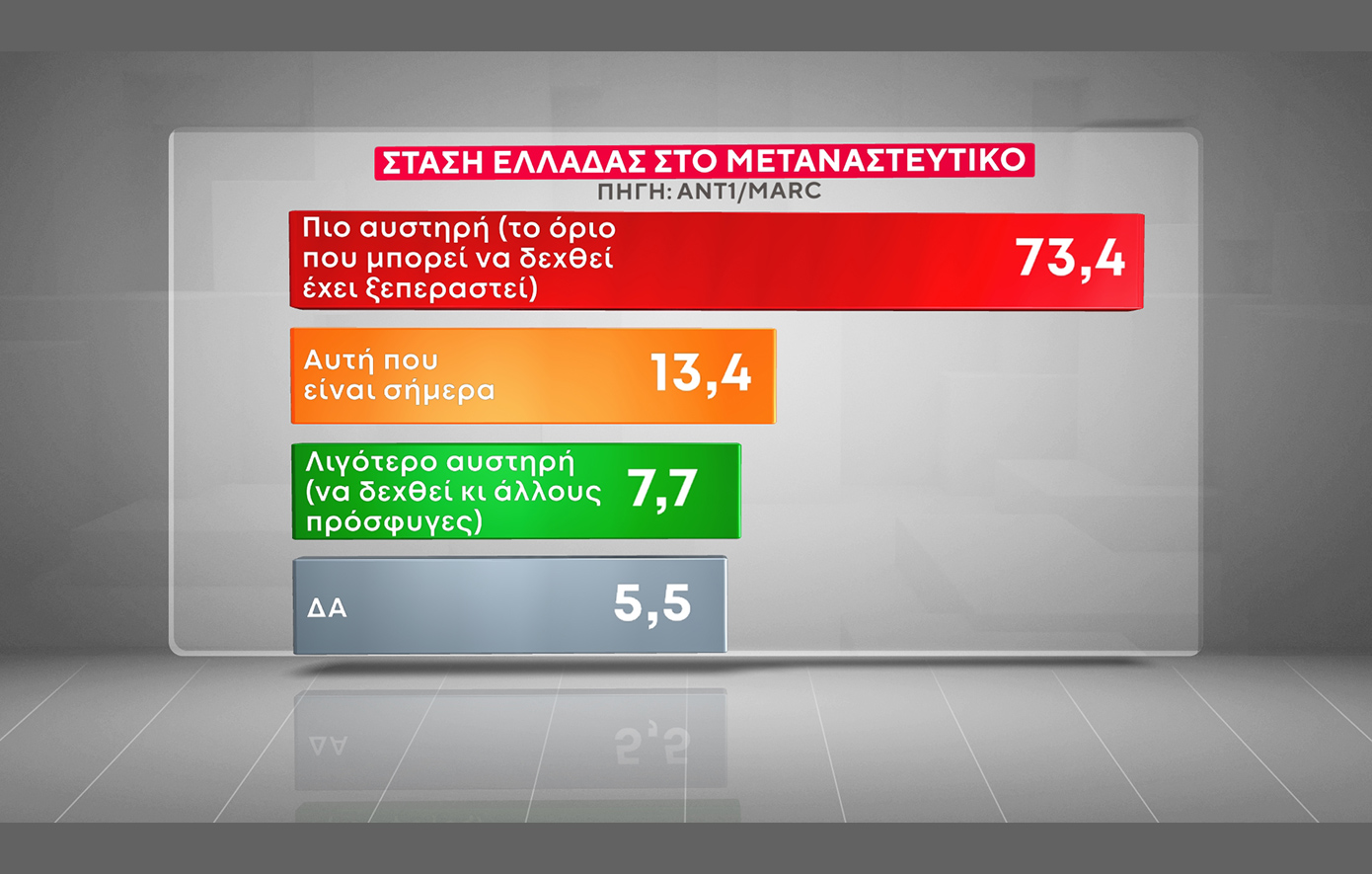 Παράλληλα, έκπληξη αποτελεί η πλειοψηφούσα απάντηση στην ερώτηση «τι κυβέρνηση θέλετε;» της έρευνας. Στην ερώτηση σχετικά με τη στάση της Ελλάδας στο μεταναστευτικό, η απάντηση «πιο αυστηρή» συγκεντρώνει το 73,4% των απαντήσεων. «Αυτή που είναι σήμερα» λέει το 13,4% και «λιγότερο αυστηρή» απαντά το 7,7%.