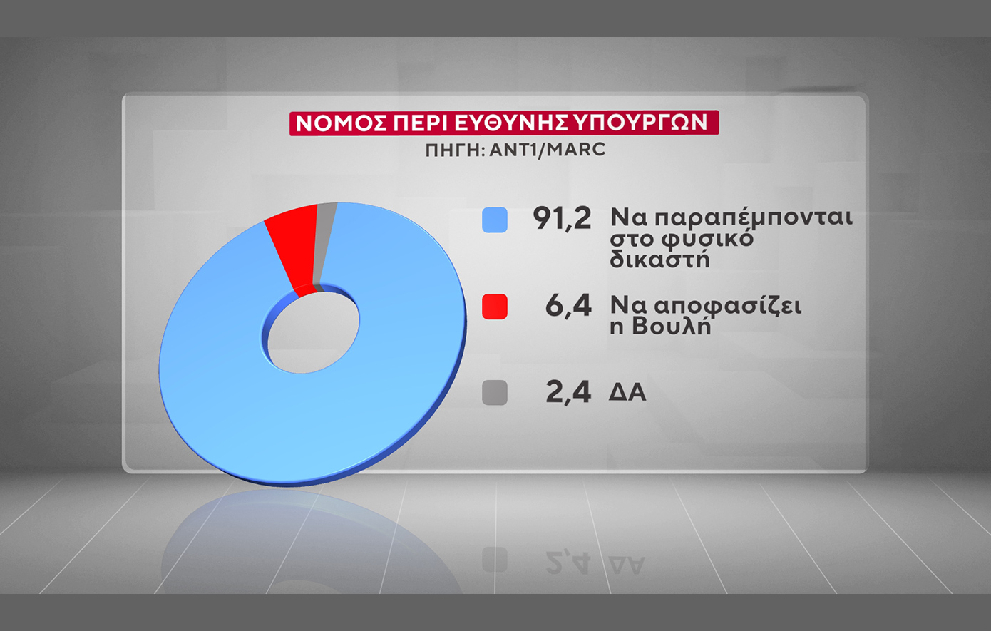 Συντριπτική είναι η πλειοψηφία και υπέρ της κατάργησης του νόμου περί ευθύνης υπουργών, καθώς το 91,2% απαντά πως οι υπουργοί πρέπει «να παραπέμπονται στον φυσικό δικαστή», ενώ μόλις 6,4% λέει πως «πρέπει να αποφασίζει η Βουλή».