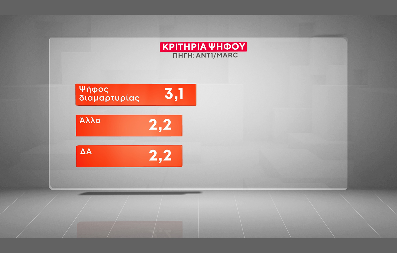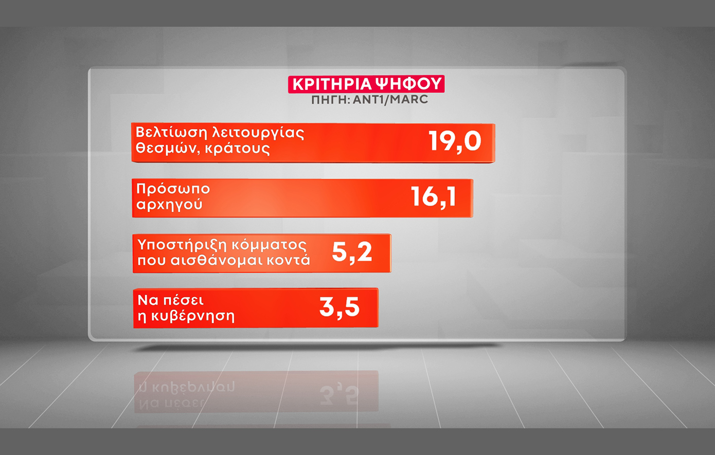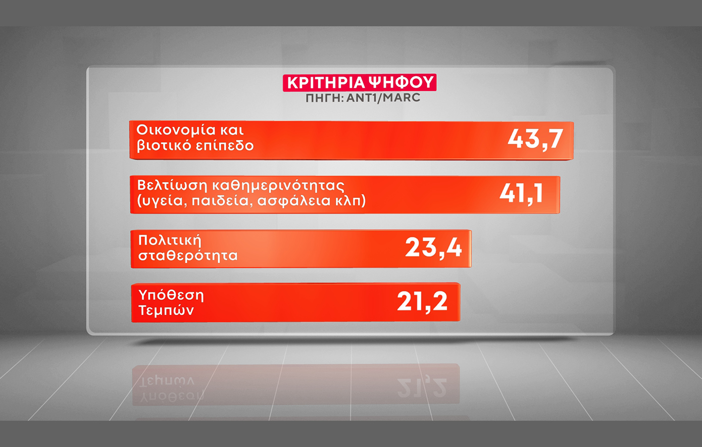 Σε ό,τι αφορά τα κριτήρια ψήφου, η «οικονομία και το βιοτικό επίπεδο» καταγράφεται πρώτο και ακολουθεί η «βελτίωση της καθημερινότητας». Συγκεκριμένα: