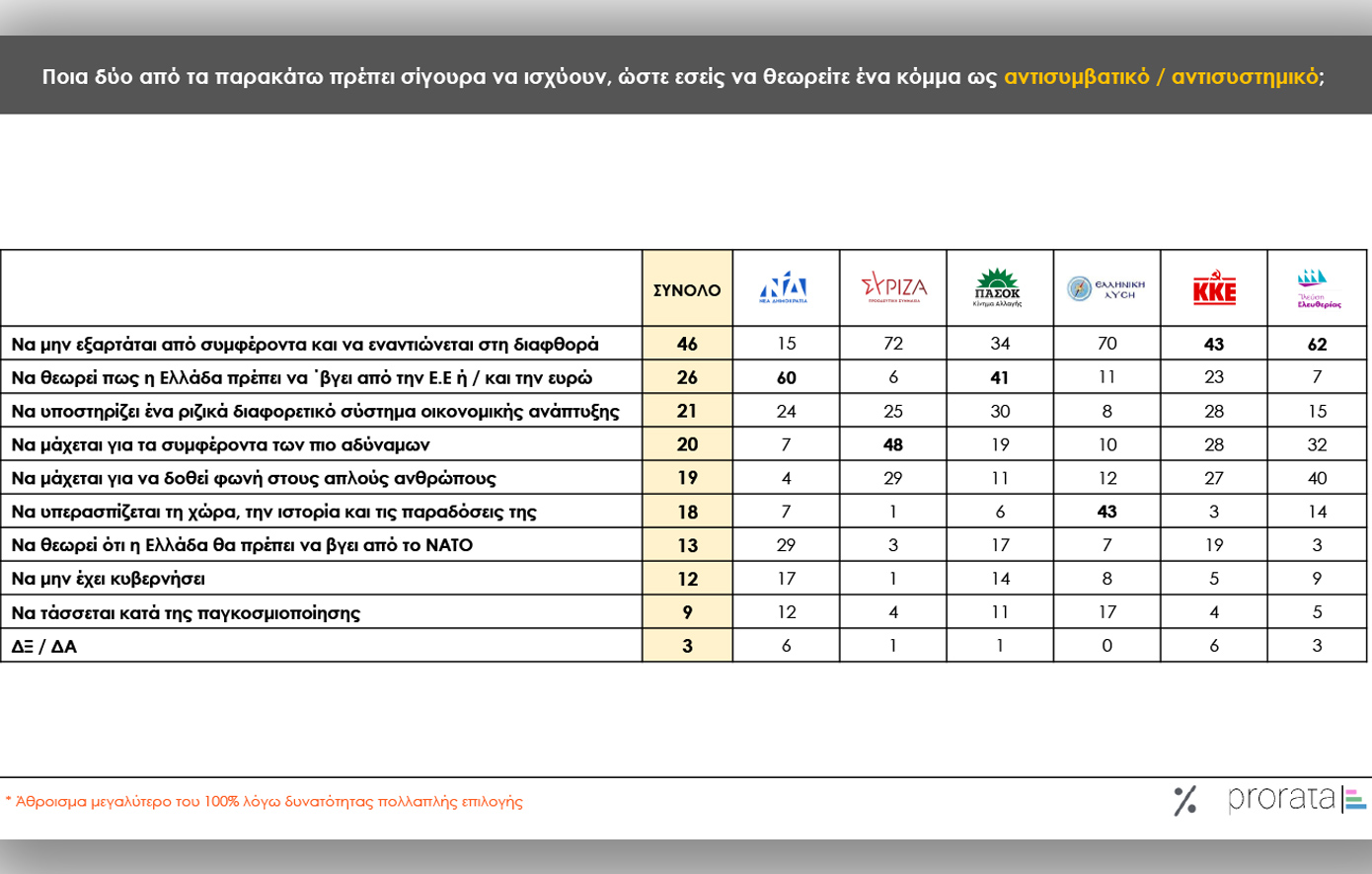 Στο ερώτημα, μάλιστα, εάν το κόμμα που θα επιλέξουν επιθυμούν να έχει συμβατικό / συστημικό προσανατολισμό ή αντισυστημικό, το 50% των ερωτηθέντων απαντά ότι θα επιλέξει συστημικές πολιτικές δυνάμεις, ισχυρό είναι ωστόσο το μερίδιο των αντισυστημικών που σκαρφαλώνει στο 42%.