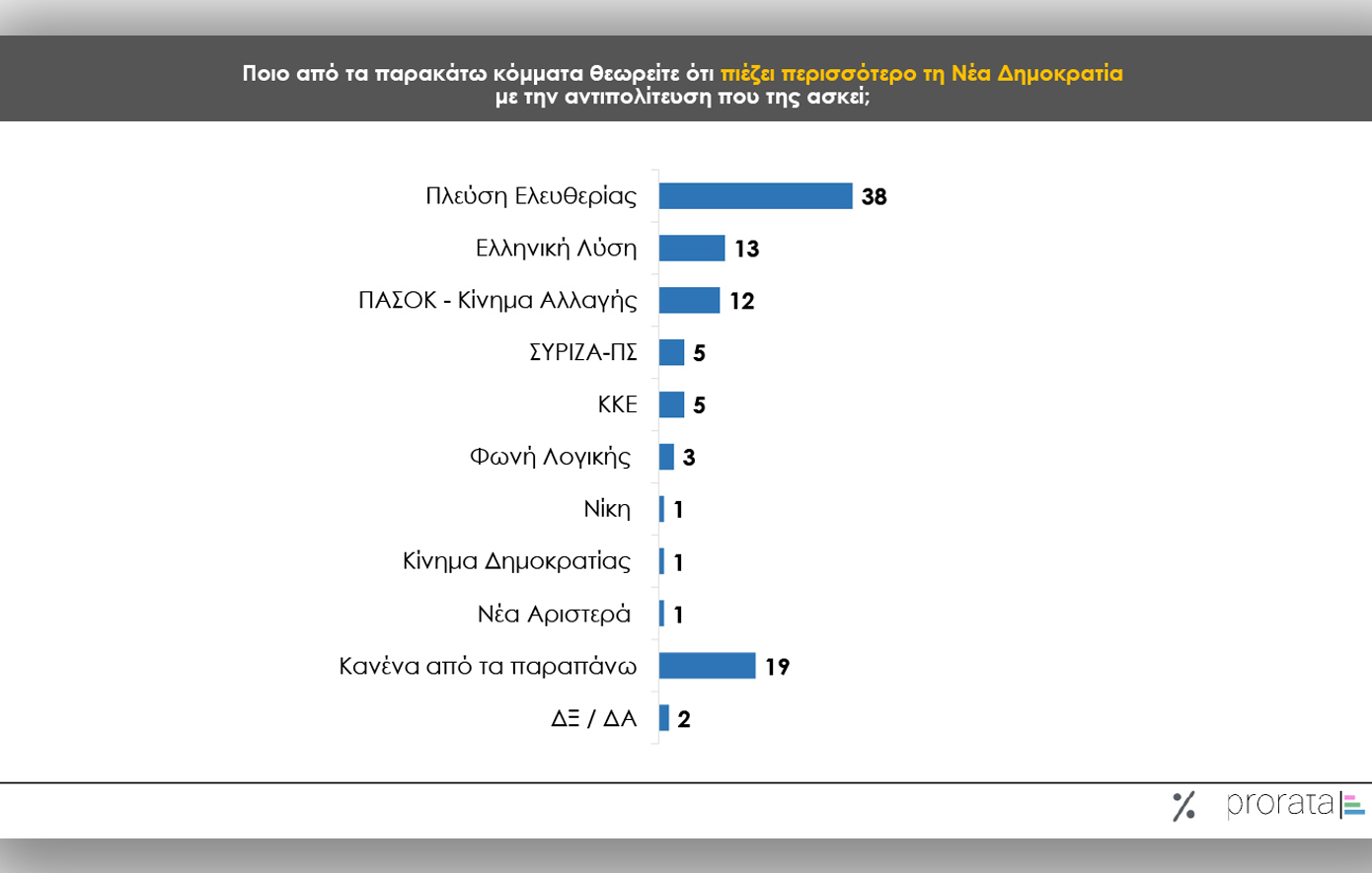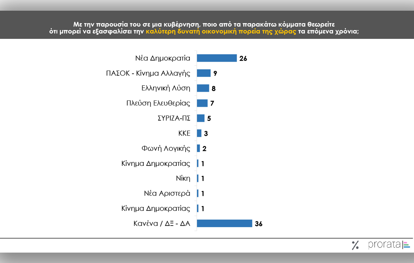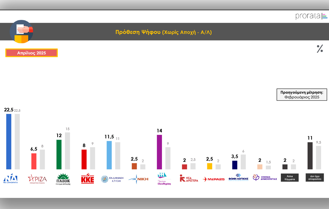 Σύμφωνα με την πρόθεση ψήφου, η ΝΔ διατηρεί την πρωτιά με 22,5% και δεύτερη είναι η παράταξη της Ζωής Κωνσταντοπούλου με 14%. Τρίτο έρχεται το ΠΑΣΟΚ με 12%, ενώ σε στενή απόσταση ακολουθεί η Ελληνική Λύση με 11,5%.