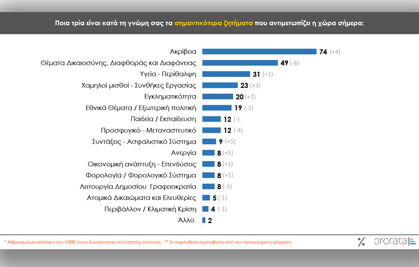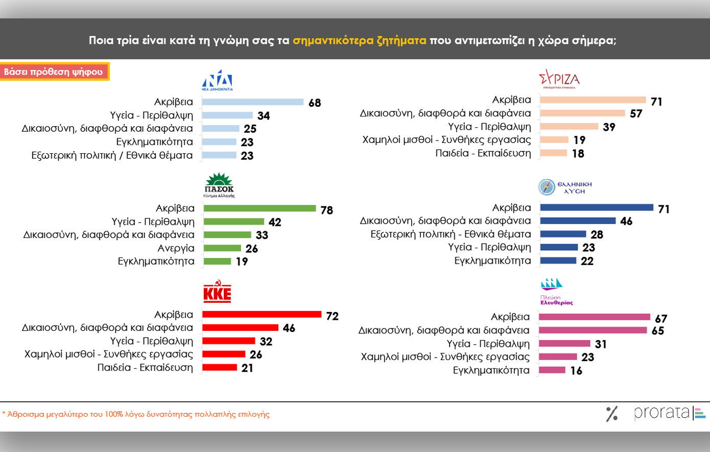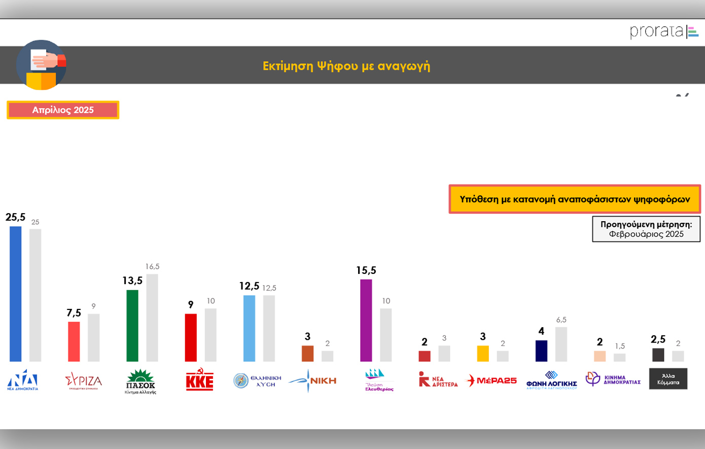 Σύμφωνα με την πρόθεση ψήφου, η ΝΔ διατηρεί την πρωτιά με 22,5% και δεύτερη είναι η παράταξη της Ζωής Κωνσταντοπούλου με 14%. Τρίτο έρχεται το ΠΑΣΟΚ με 12%, ενώ σε στενή απόσταση ακολουθεί η Ελληνική Λύση με 11,5%.