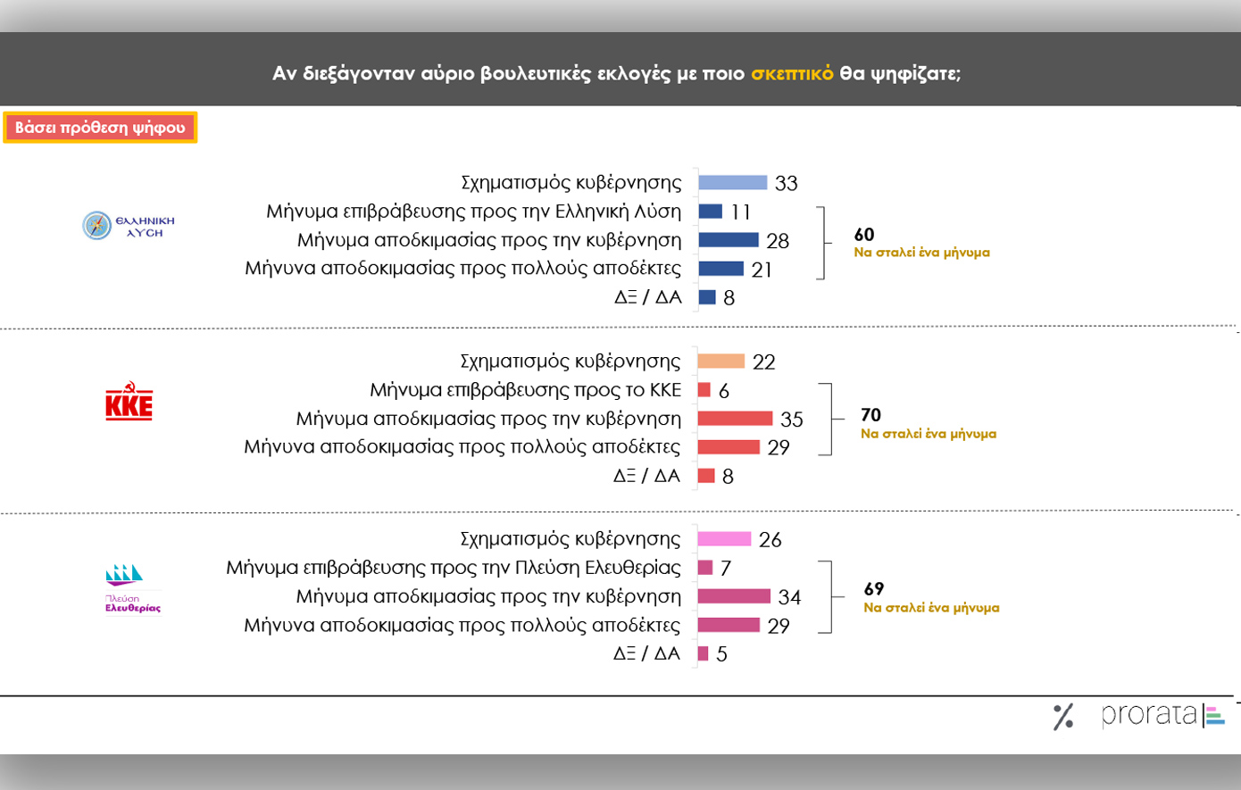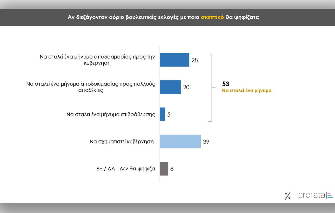 Αξιοσημείωτο εύρημα της έρευνας, που εξηγεί έως ένα βαθμό την ενίσχυση συνολικά των αντισυστημικών κομμάτων, είναι ότι στο ερώτημα «με ποιο σκεπτικό θα ψηφίζατε εάν διεξάγονταν αύριο εκλογές, το 53% δηλώνει ότι θα προσέλθει στην κάλπη για να στείλει μήνυμα και μόνο το 39% για να σχηματιστεί κυβέρνηση.