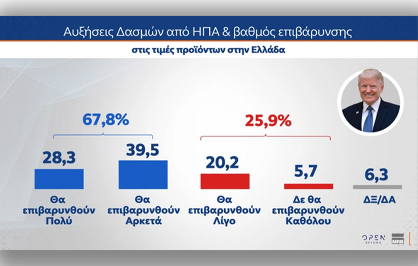 Στον απόηχο των δασμών που ανακοίνωσε ο Ντόναλντ Τραμπ, το 67,8% ανησυχεί πως θα υπάρξει επιβάρυνση στις τιμές των προϊόντων στη χώρα, ενώ το 25,9% απαντά πως ή θα υπάρξει μικρή επιβάρυνση ή καμία.