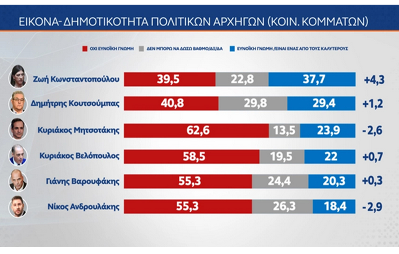 Δημοφιλέστερη πολιτική αρχηγός εμφανίζεται η Ζωή Κωνσταντοπούλου με 37,7% θετικές απόψεις και 39,5% αρνητικές και ακολουθούν:
