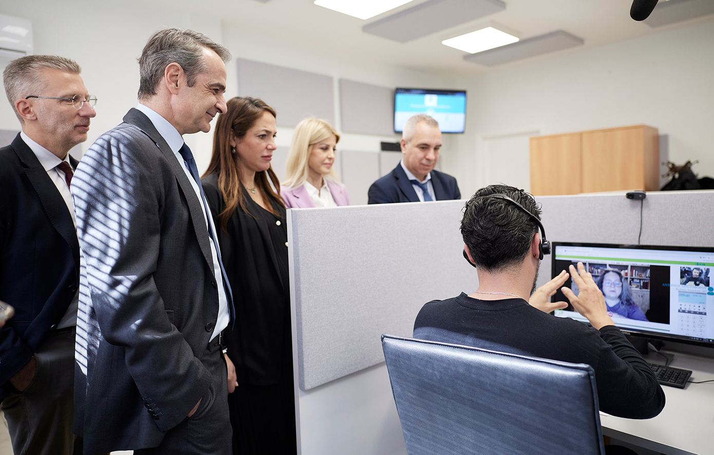 Κατά την παραμονή του στο Εθνικό Κέντρο Κωφών, ο Πρωθυπουργός επισκέφθηκε το κέντρο εξ αποστάσεως διερμηνείας που στεγάζεται σε ειδικά διαμορφωμένη αίθουσα του Κέντρου, όπου ενημερώθηκε για τη λειτουργία της υπηρεσίας και συνομίλησε με τους διερμηνείς που τη στελεχώνουν. Ο Πρωθυπουργός και η Υπουργός Κοινωνικής Συνοχής και Οικογένειας Δόμνα Μιχαηλίδου είχαν επίσης την ευκαιρία να συνομιλήσουν με μία χρήστη της υπηρεσίας και να την ενημερώσουν σχετικά με την ανακοίνωση που προηγήθηκε για τη διεύρυνση του επιδόματος κωφών και βαρήκοων.