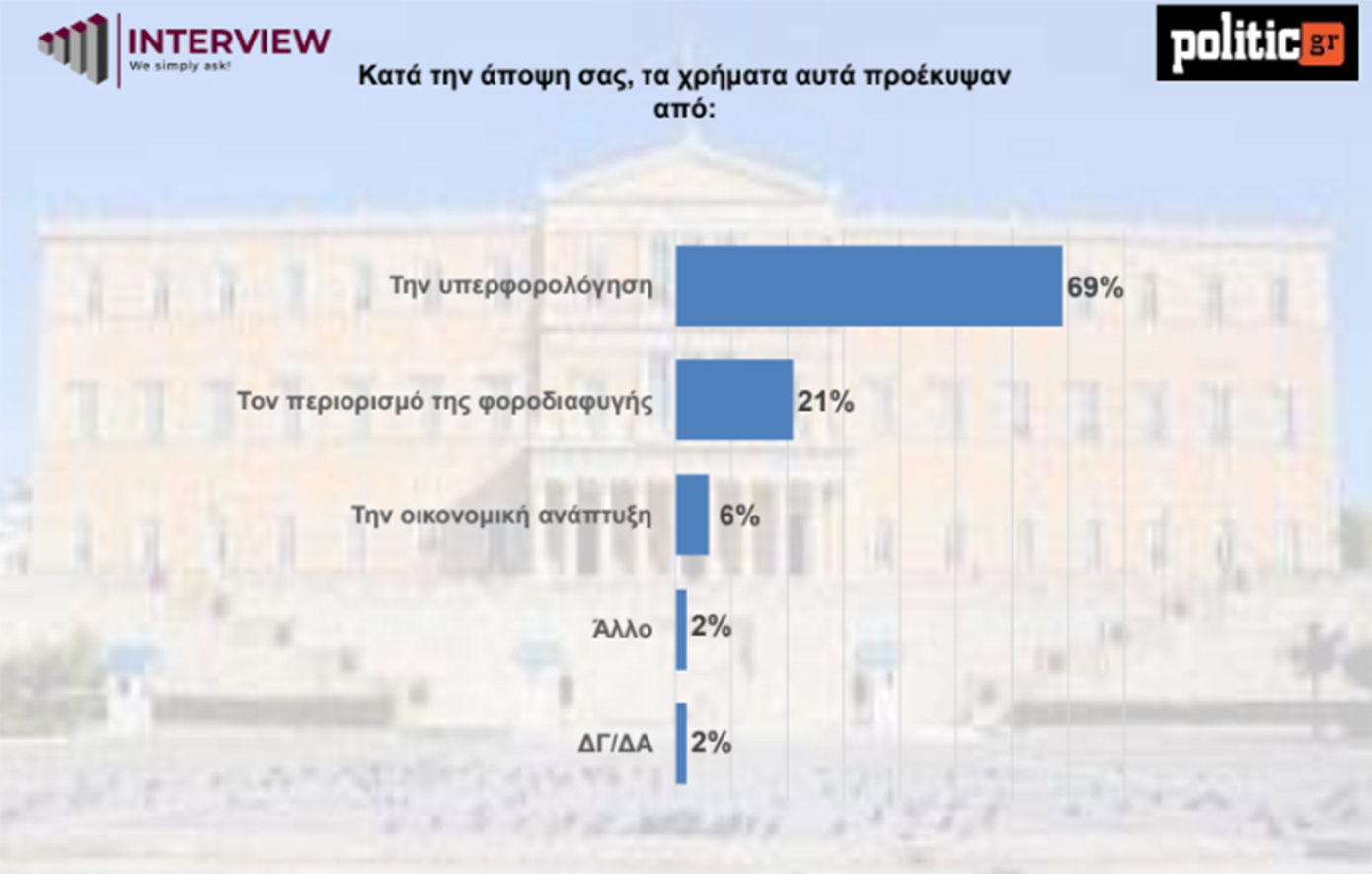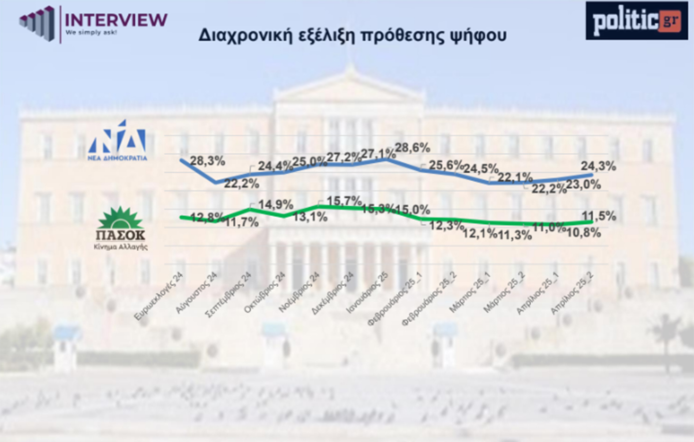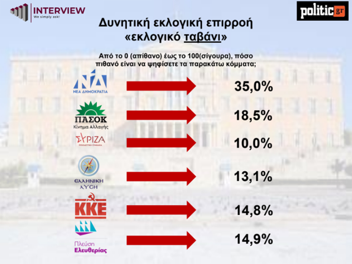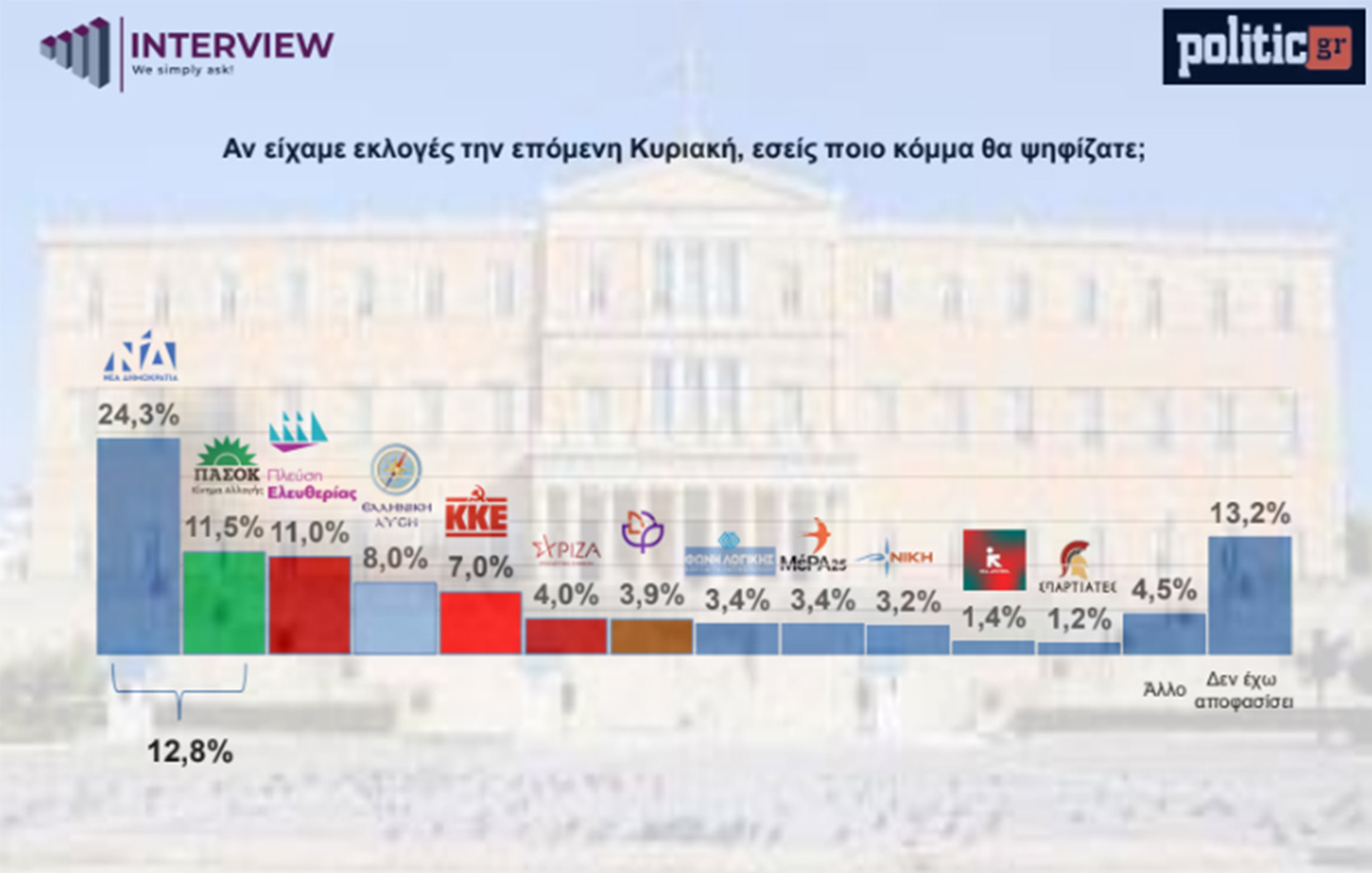 Νέα δημοσκόπηση της Interview για την ιστοσελίδα politic.gr καταγράφει μικρή κάμψη της Πλεύσης Ελευθερίας και φέρνει το ΠΑΣΟΚ ξανά δεύτερο. Η Νέα Δημοκρατία καταγράφει μικρή άνοδο 2,1 μονάδων σε σχέση με τον Μάρτιο.