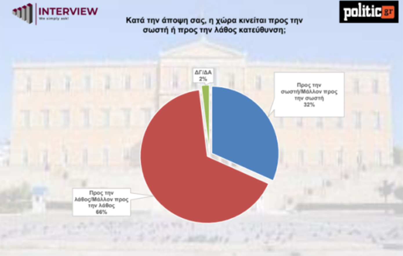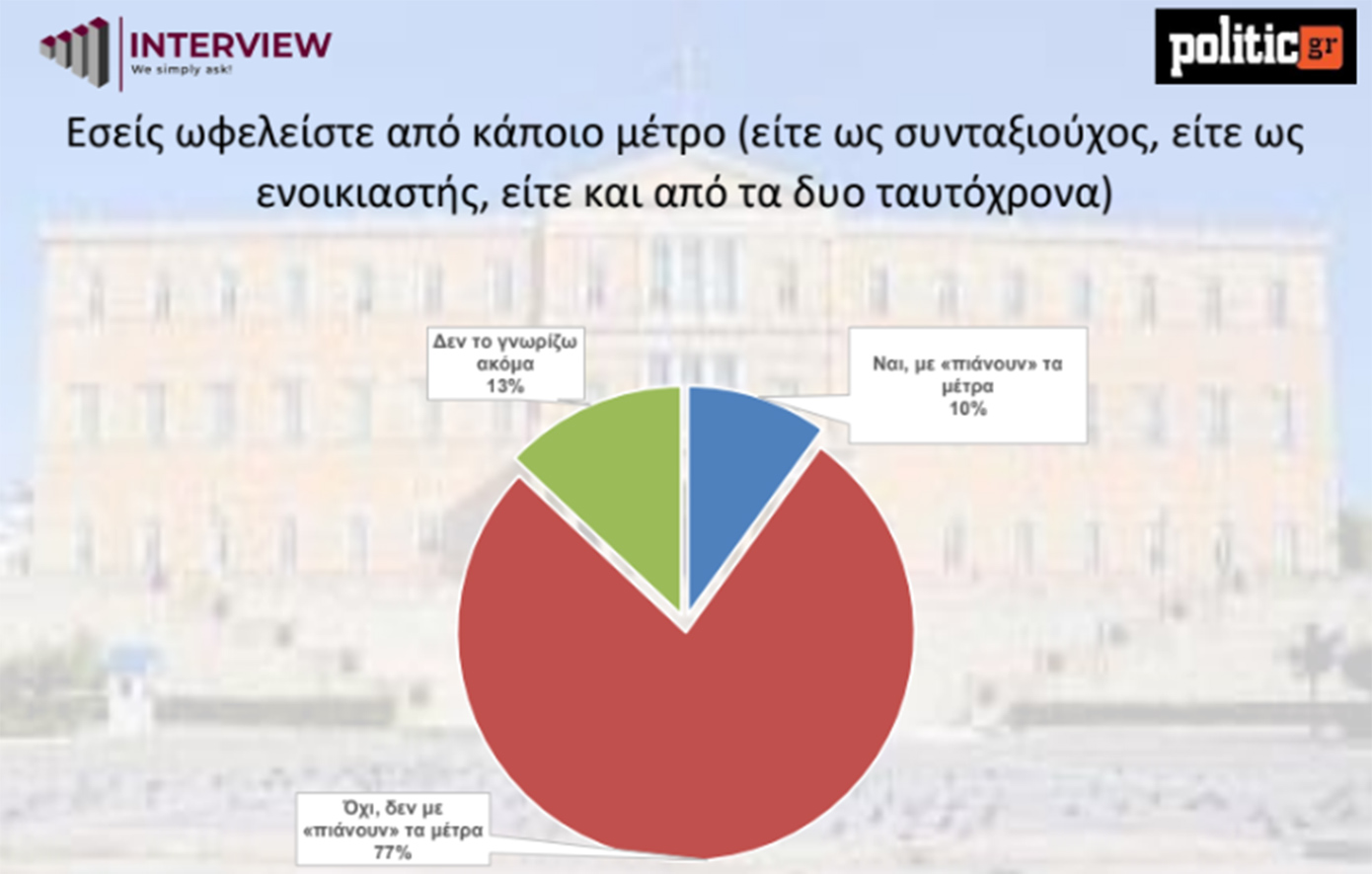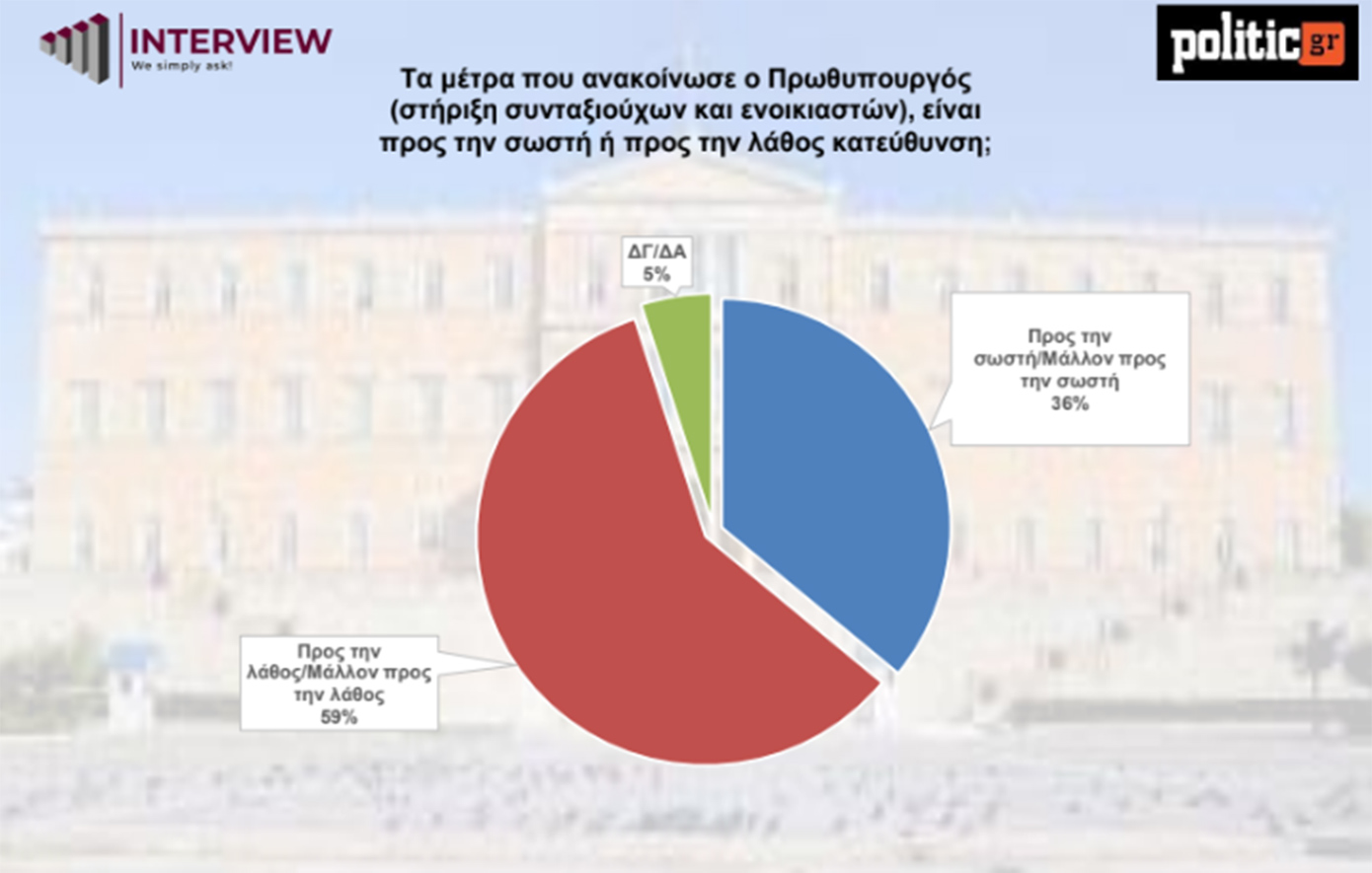 Τα μέτρα στήριξης που ανακοίνωσε ο πρωθυπουργός για συνταξιούχους και ενοικιαστές δεν αλλάζουν το κλίμα. Το 59% των ερωτηθέντων θεωρεί ότι κινούνται σε λάθος κατεύθυνση, σε αντίθεση με το 36% που τα κρίνει θετικά.