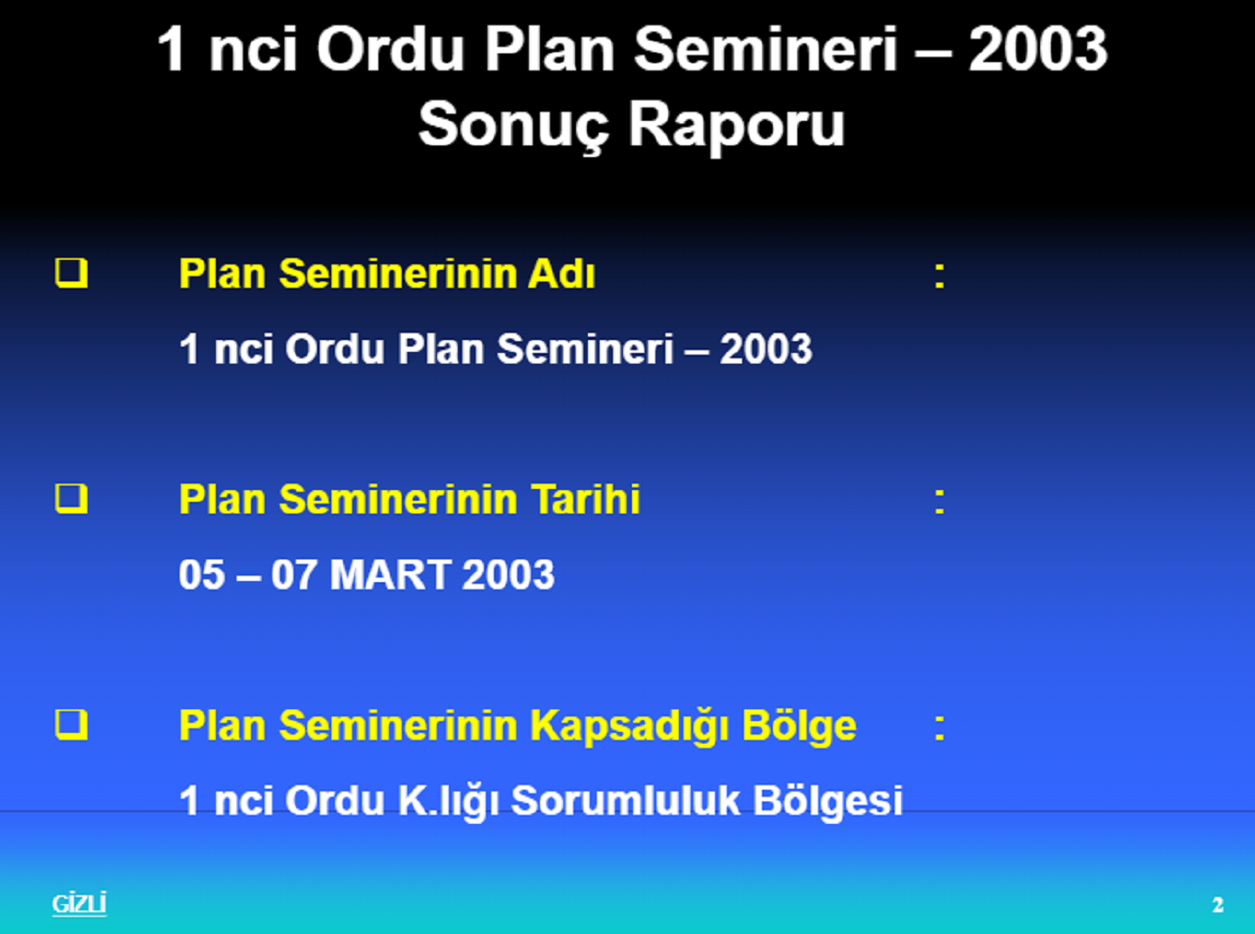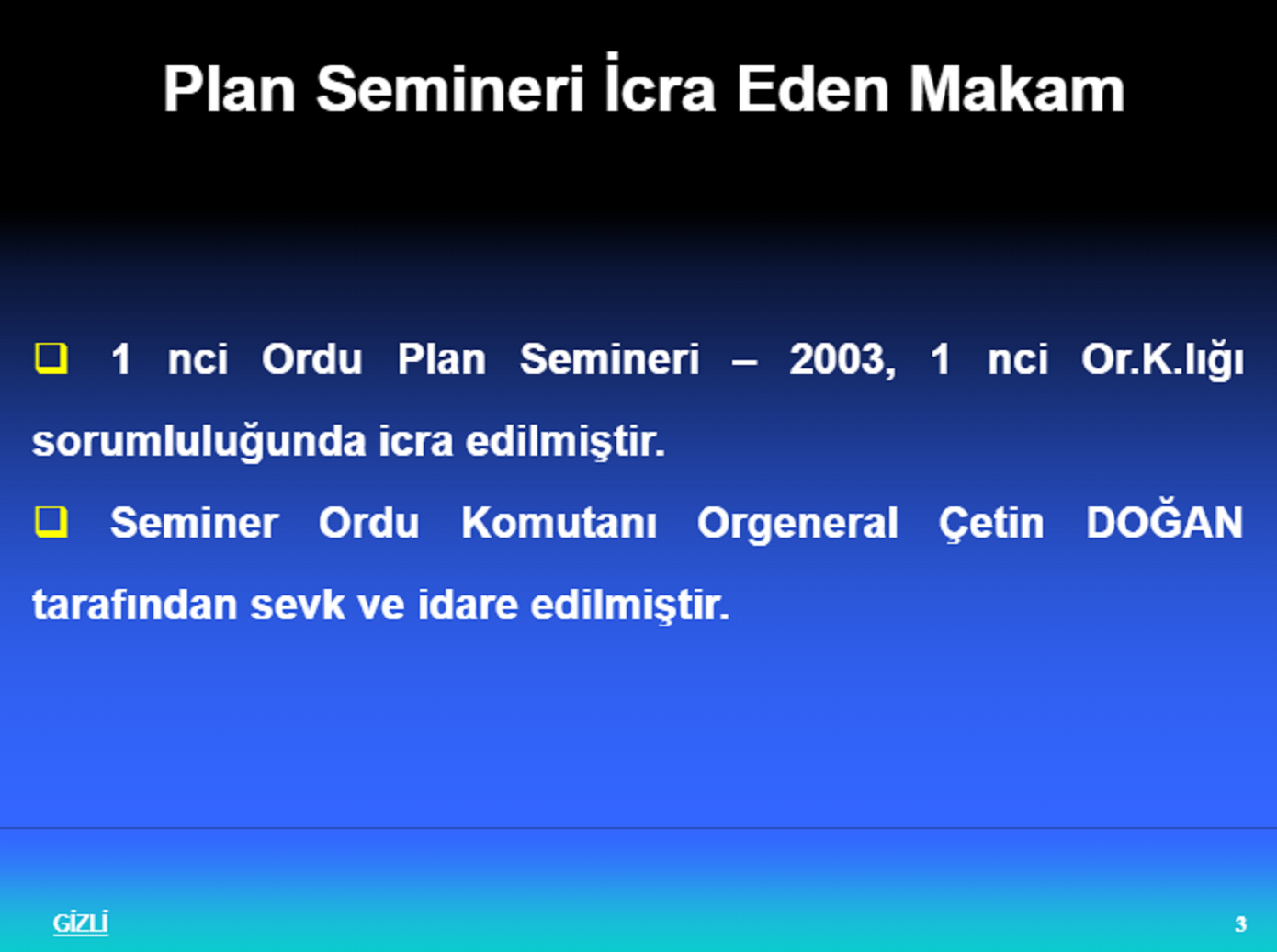 Για πρώτη φορά παρουσιάστηκε σε στρατιωτικό σεμινάριο στις 5-7 Μαρτίου 2003, υπό την ηγεσία του στρατηγού Çetin Doğan, τότε διοικητή του 1ου Σώματος Στρατού με έδρα την Κωνσταντινούπολη. Στο σεμινάριο συμμετείχαν πολλοί αξιωματικοί και εκπρόσωποι του τουρκικού Γενικού Επιτελείου.