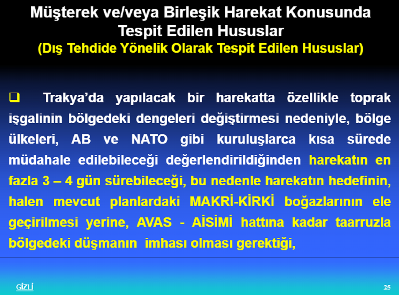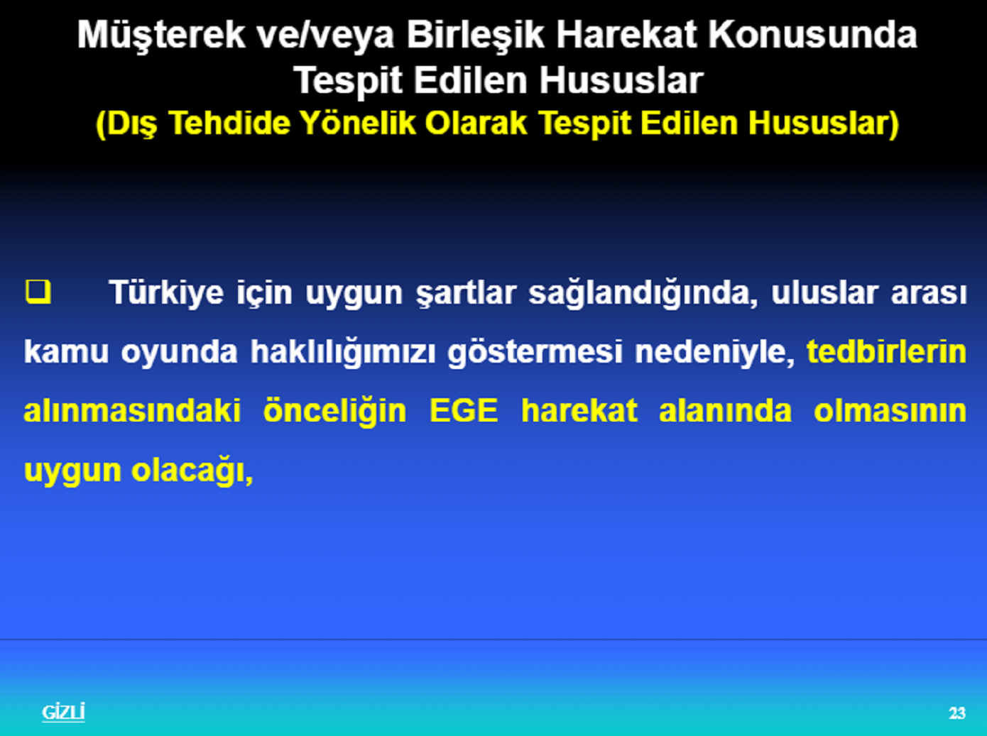 Η τουρκική ιστοσελίδα Νordic Μonitor δημοσίευσε το Power Point που εξέτασε η τουρκική στρατιωτική ηγεσία και σημείωσε ότι πιθανώς το σχέδιο δεν έχει απορριφθεί σήμερα, αλλά επικαιροποιηθεί για να ανταποκρίνεται στις τωρινές απαιτήσεις.
