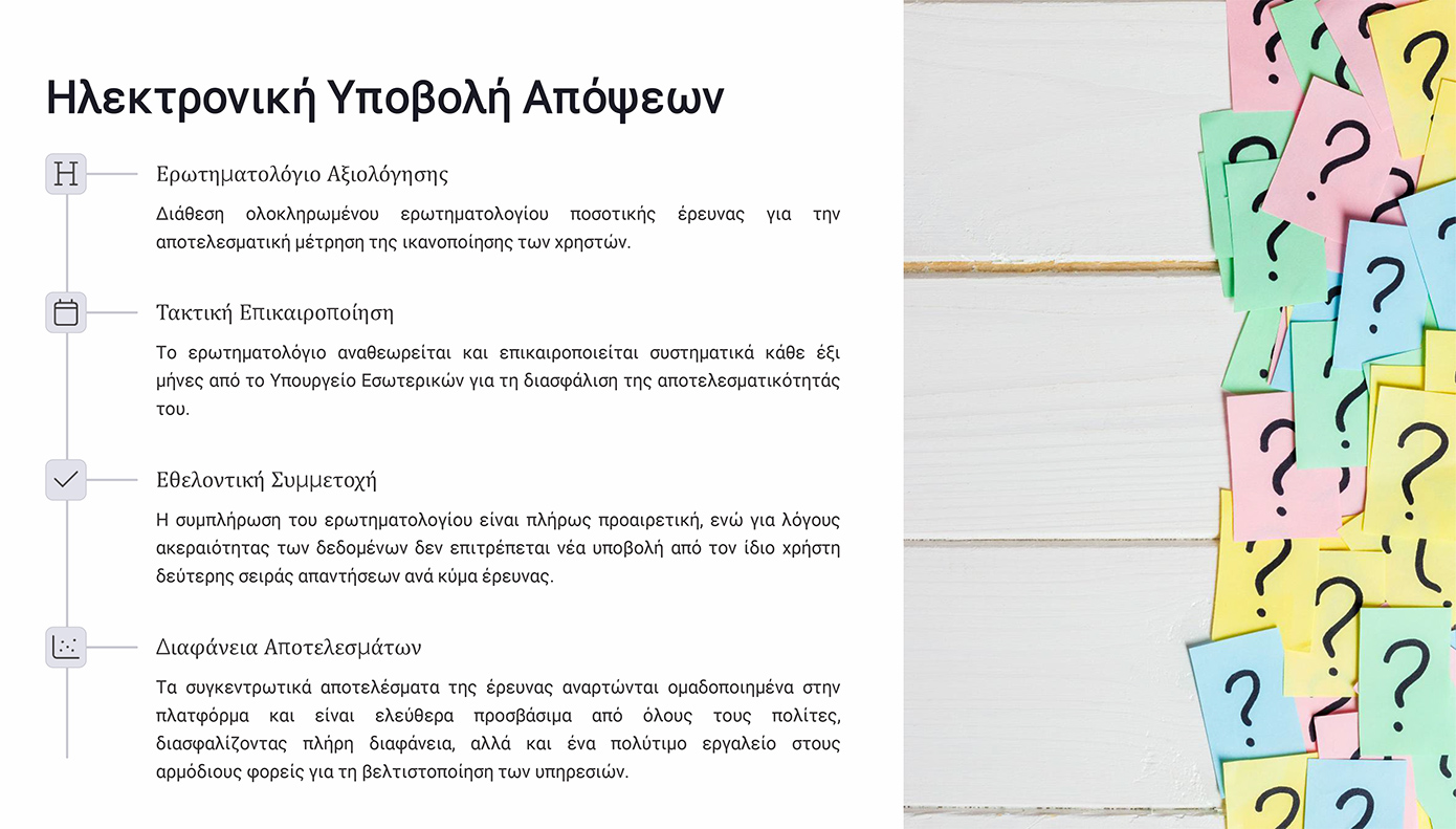 Πέραν των ερωτήσεων, οι πολίτες θα μπορούν να γράψουν ένα σύντομο ελεύθερο κείμενο και να προτείνουν υπηρεσίες που θα ήθελαν να δουν να ψηφιοποιούνται. Το ερωτηματολόγιο δεν θα αφορά προσωπικά αιτήματα ή αξιολόγηση μεμονωμένων υπαλλήλων.