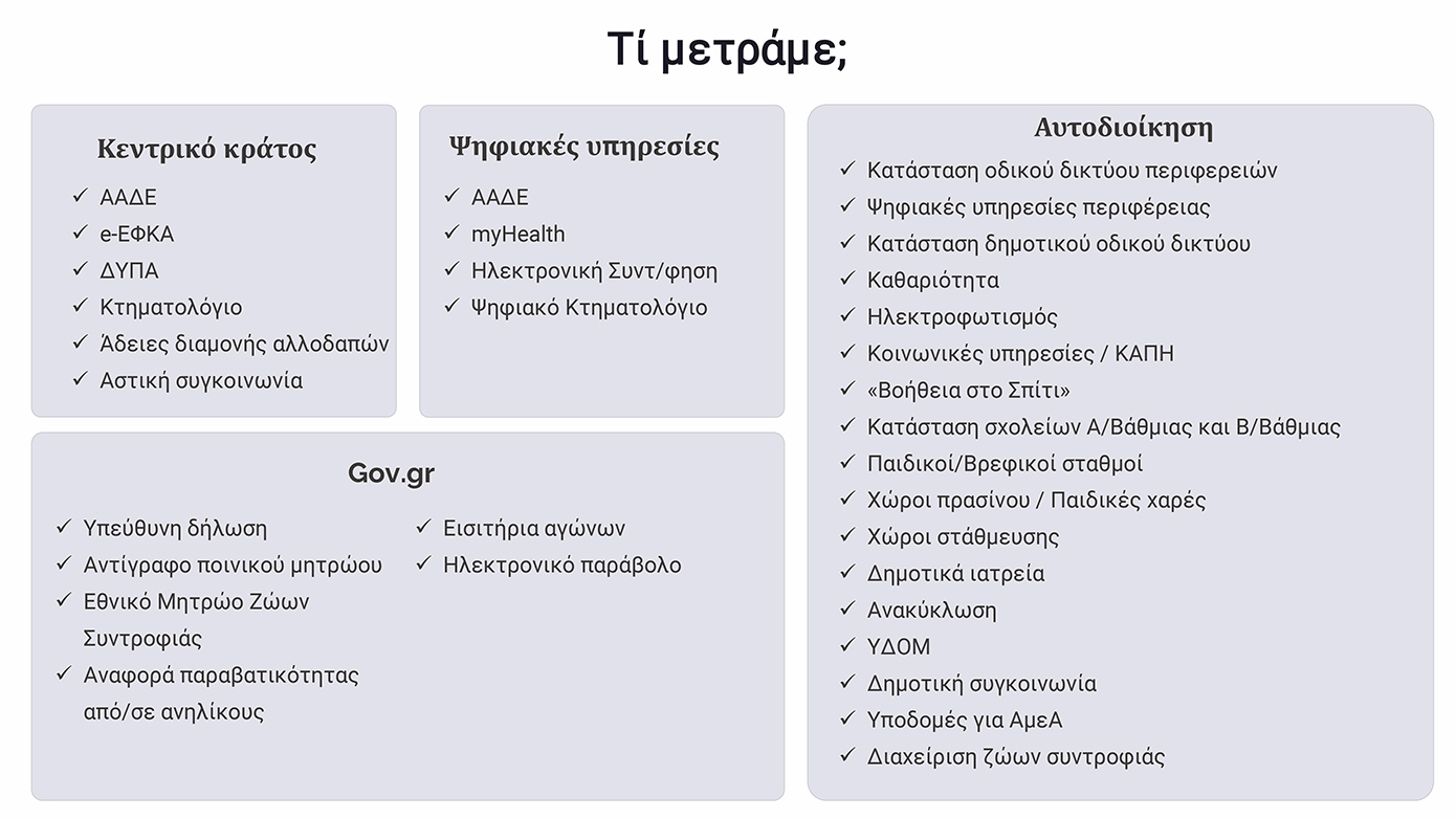 Το ερωτηματολόγιο περιλαμβάνει υλικό για μεγάλους κεντρικούς φορείς, όπως ο e-ΕΦΚΑ και η ΑΑΔΕ, τα μέσα μεταφοράς, καθώς και για πληθώρα υπηρεσιών ή χώρων που προσφέρει η Τοπική Αυτοδιοίκηση, όπως η καθαριότητα, η ποιότητα των δρόμων, ο δημόσιος ηλεκτροφωτισμός, η διαθεσιμότητα χώρων στάθμευσης, οι παιδικές χαρές, οι υποδομές για πολίτες με αναπηρία και η μέριμνα για ζώα συντροφιάς. Οι πολίτες θα μπορούν επίσης να αξιολογήσουν εφαρμογές του gov.gr και ψηφιακές υπηρεσίες, όπως την ηλεκτρονική συνταγογράφηση.