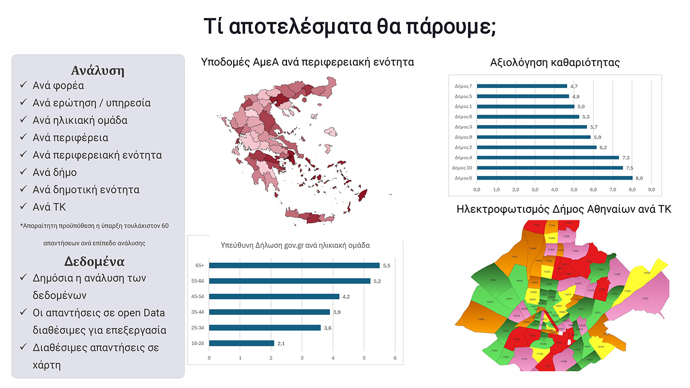 Τα δεδομένα που θα προκύψουν θα είναι διαθέσιμα σε όλους (open data), λειτουργώντας ως εργαλείο διαφάνειας και λογοδοσίας για τη βελτίωση του κράτους. Θα διατίθενται επίσης γραφήματα, χάρτες και άλλες μορφές οπτικής απεικόνισης των στοιχείων.