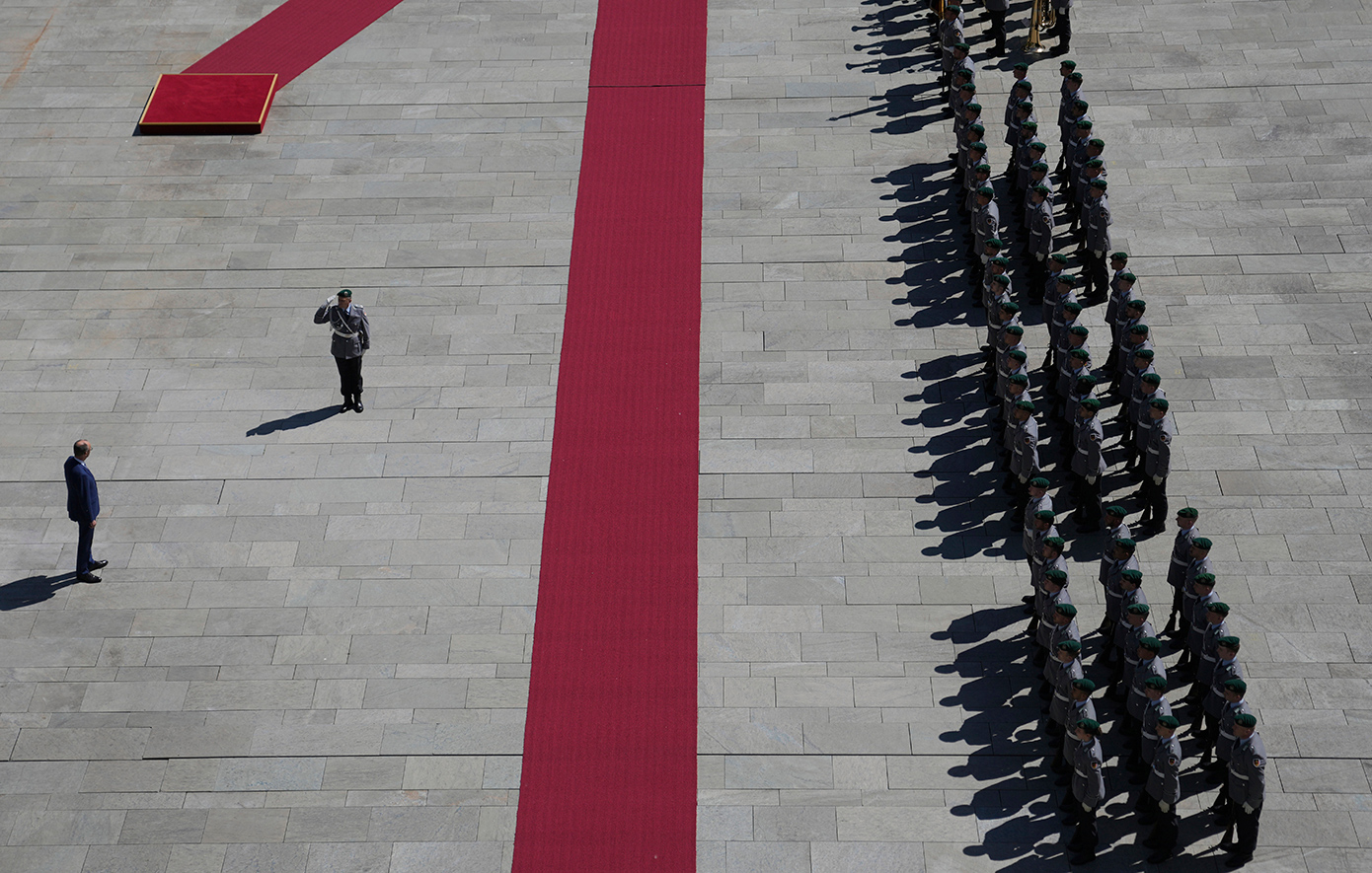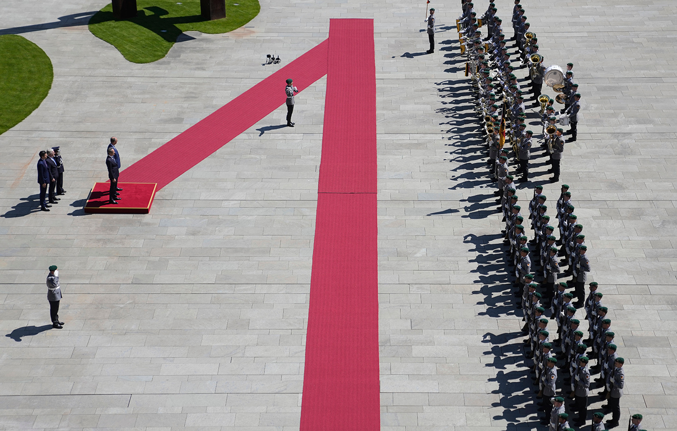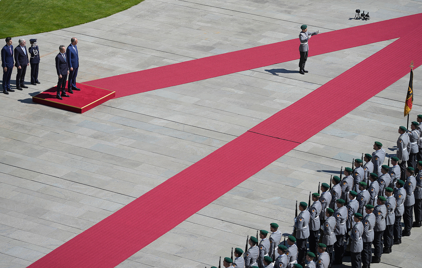 Ο πρωθυπουργός έφτασε στην καγκελαρία, όπου τον υποδέχθηκε ο Φρίντριχ Μερτς και έγινε δεκτός με στρατιωτικές τιμές.