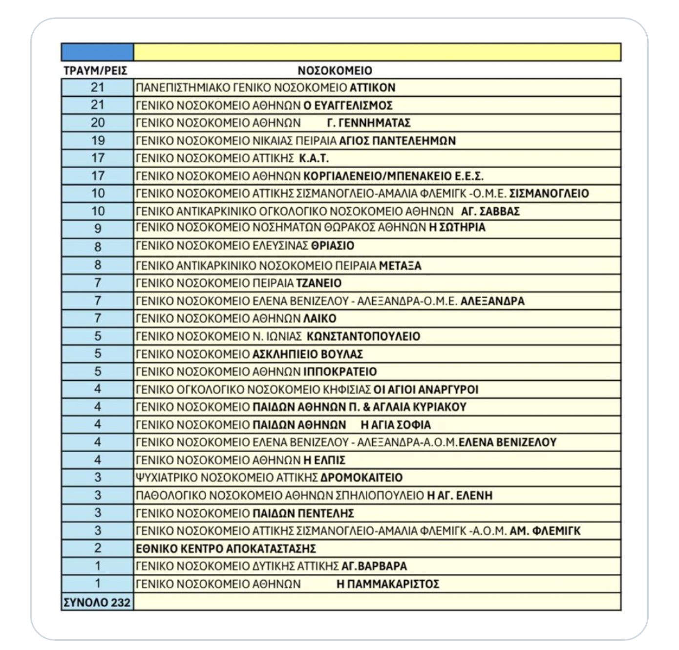 «Στον πίνακα βλέπετε, ανά νοσοκομείο, τους επιπλέον τραυματιοφορείς που διορίζουμε με την @nkerameus και την @dypa_official για την μείωση της ταλαιπωρίας σας στις εφημερίες! 232 διορίζονται στα Τμήματα Επειγόντων περιστατικών και άλλοι 268 στα Νοσοκομεία γενικά».