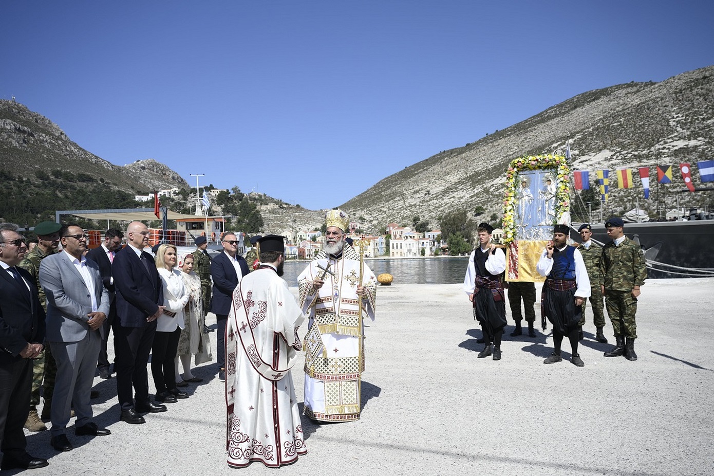 Ο υπουργός Εθνικής Άμυνας παρακολούθησε την Πανηγυρική Θεία Λειτουργία στον Ιερό Μητροπολιτικό Ναό Αγίων Κωνσταντίνου και Ελένης Καστελλορίζου, στην οποία χοροστάτησε ο Σεβασμιώτατος Μητροπολίτης Σύμης, Τήλου, Χάλκης και Καστελλορίζου Χρυσόστομος. Αμέσως μετά συμμετείχε στη λιτάνευση της ιερής εικόνας.
