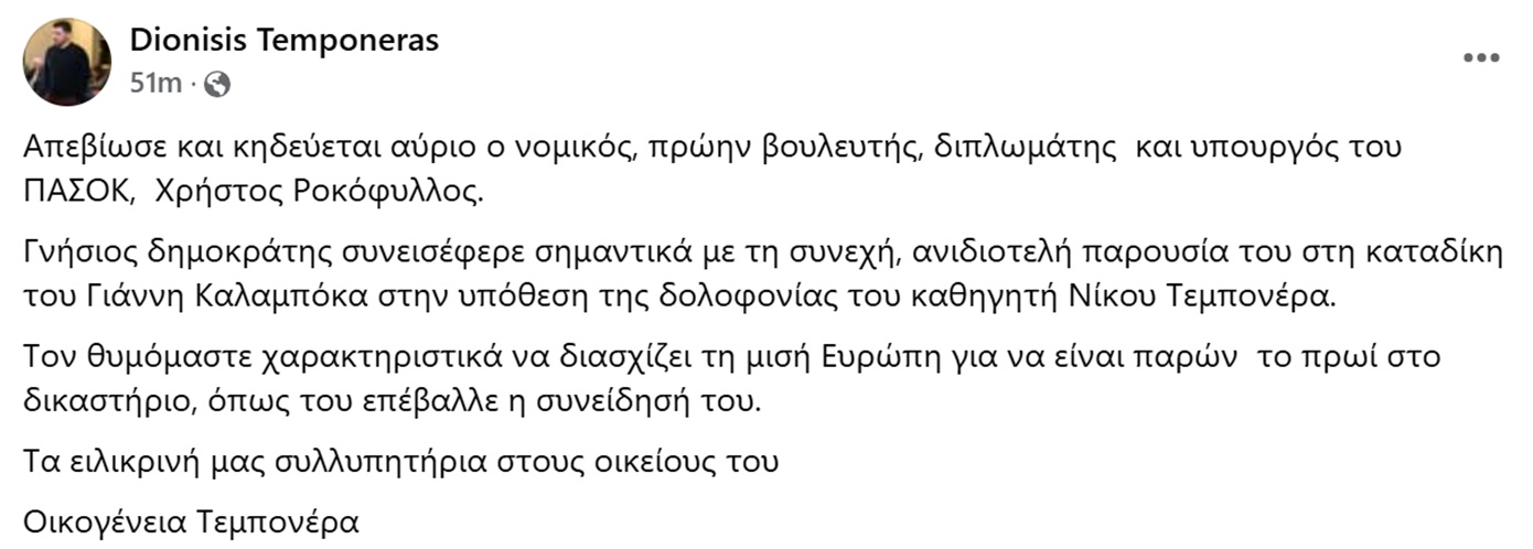 Με λόγια συγκίνησης και ευγνωμοσύνης αποχαιρετά η οικογένεια Τεμπονέρα τον Χρήστο Ροκόφυλλο, εκφράζοντας δημόσια τη θλίψη της για την απώλειά του. Ο Διονύσης Τεμπονέρας, γιος του αείμνηστου καθηγητή Νίκου Τεμπονέρα, ο οποίος δολοφονήθηκε τον Ιανουάριο του 1991, προχώρησε σε σχετική ανάρτηση στα μέσα κοινωνικής δικτύωσης.