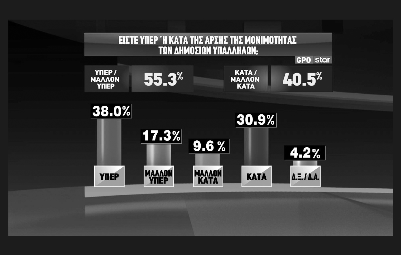 Στο ερώτημα για την άρση της μονιμότητας στους Δημοσίους Υπαλλήλους το 55,3% τάσσεται υπέρ και το 40,5% κατά.