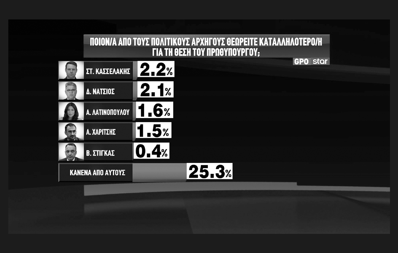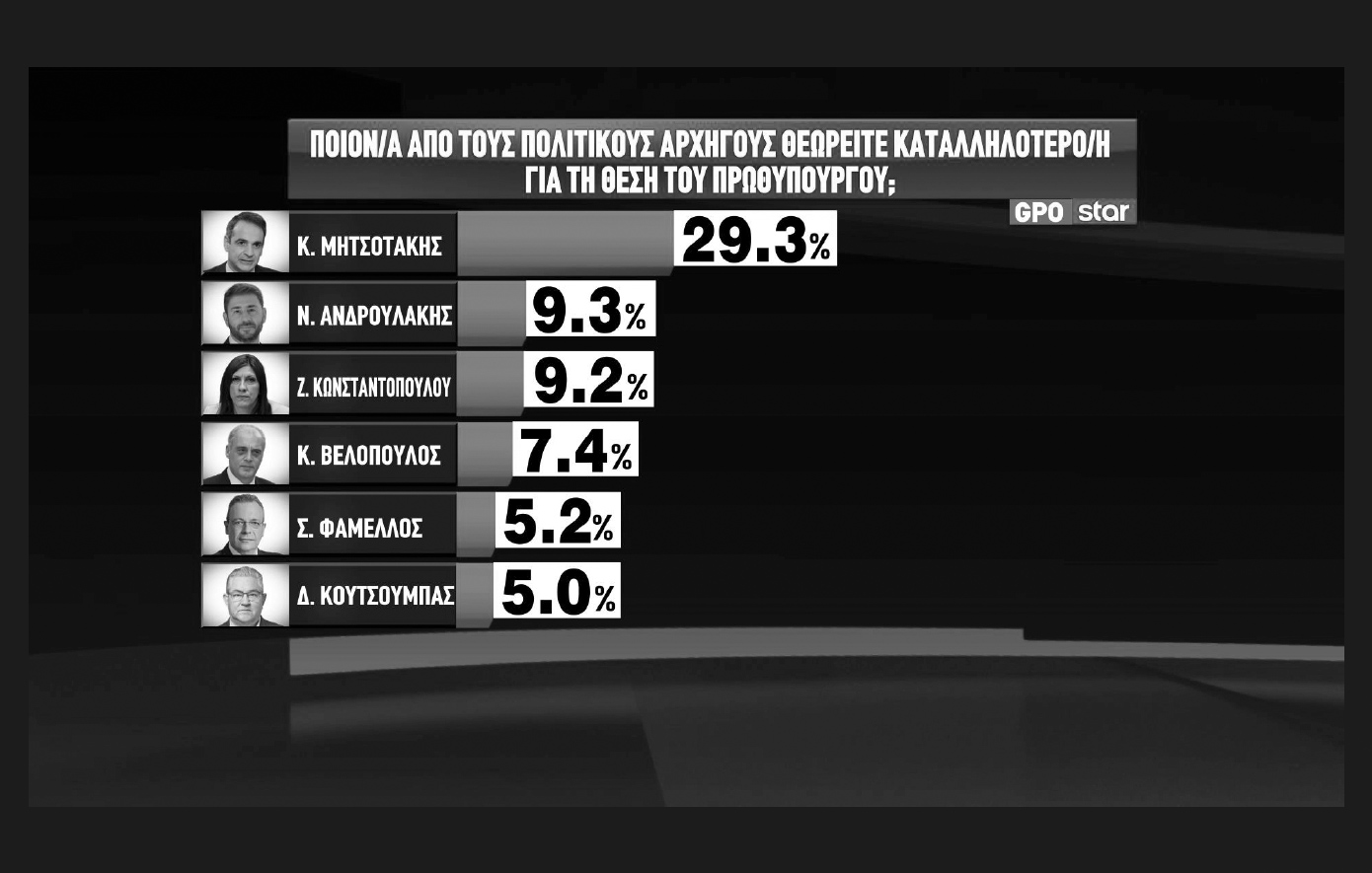 Καταλληλότερος για πρωθυπουργός αναδεικνύεται ο Κυριάκος Μητσοτάκης με 29,3% και ακολουθούν: Νίκος Ανδρουλάκης 9,3%, Ζωή Κωνσταντοπούλου 9,2%, Κυριάκος Βελόπουλος 7,4%, Σωκράτης Φάμελλος 5,2%, Δημήτρης Κουτσούμπας 5%, Στέφανος Κασσελάκης 2,2%, Δημήτρης Νατσιός 2,1%, Αφροδίτη Λατινοπούλου 1,6%.