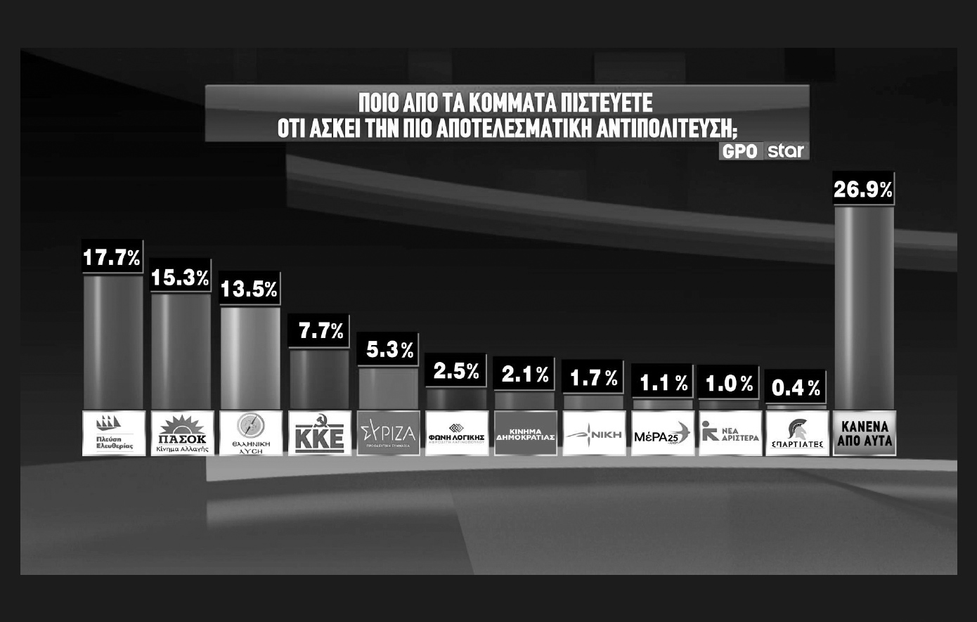 Πιο αποτελεσματική αντιπολίτευση σύμφωνα με την έρευνα είναι η Πλεύση Ελευθερίας με 17,7%, ακολουθεί το ΠΑΣΟΚ με 15,3%, η Ελληνική Λύση με 13,5%, το ΚΚΕ με 7,7%, ο ΣΥΡΙΖΑ με 5,3%, η Φωνή Λογικής με 2,2%, το Κίνημα Δημοκρατίας με 2,1%, η Νίκη με 1,7%, το ΜέΡΑ25 με 1,1%, η Νέα Αριστερά με 1%, ενώ 0,4% καταγράφουν οι Σπαρτιάτες.