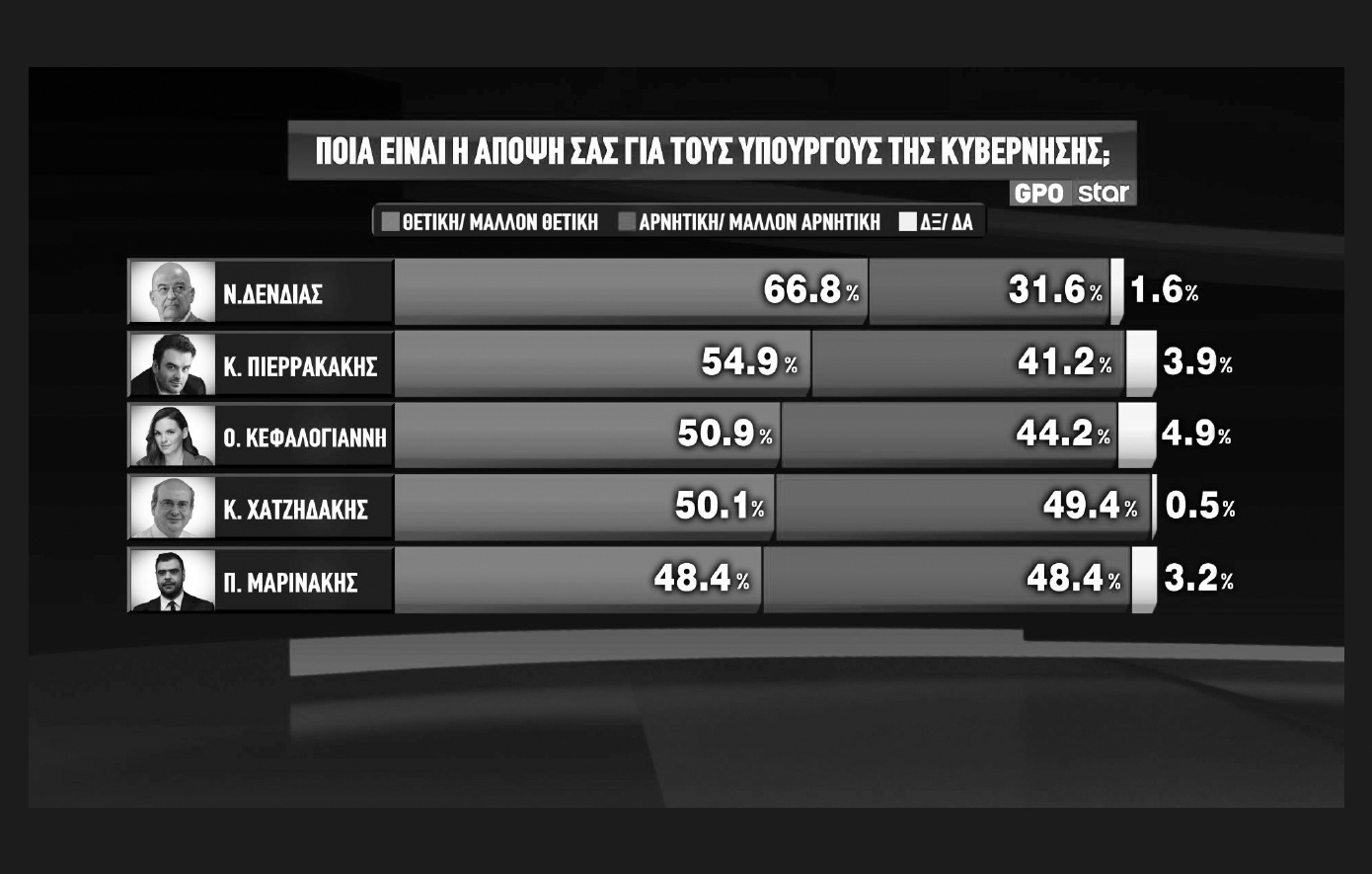 Στη δημοφιλία των υπουργών ο υπουργός Εξωτερικών, Νίκος Δένδιας έρχεται πρώτος με 66,8% θετικές γνώμες και ακολουθούν, ο υπουργός Οικονομικών, Κυριάκος Πιερρακάκης με 54,9%, η υπουργός Τουρισμού, Όλγα Κεφαλογιάννη με 50,9%, ο αντιπρόεδρος της κυβέρνησης, Κωστής Χατζηδάκης με 50,1%, ενώ ο κυβερνητικός εκπρόσωπος Παύλος Μαρινάκης με 48,4%, κλείνει την πρώτη πεντάδα.