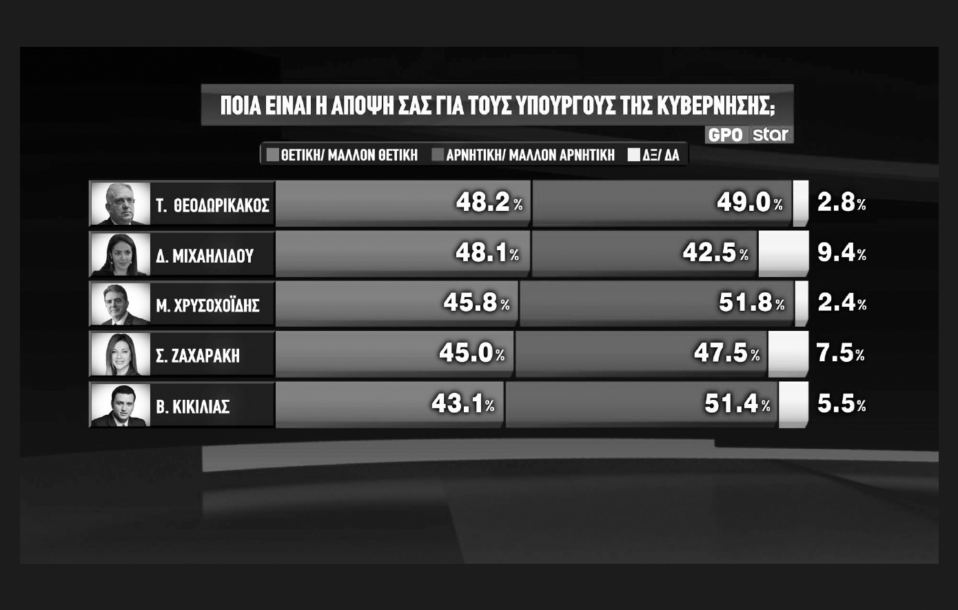 Ακολουθούν, ο υπουργός Ανάπτυξης, Τάκης Θεοδωρικάκος με 48,2%, η υπουργός Οικογένειας και Κοινωνικής Συνοχής, Δόμνα Μιχαηλίδου με 48,1%, ο υπουργός Προστασίας του Πολίτη, Μιχάλης Χρυσοχοΐδης με 45,8%, η υπουργός Παιδείας Σοφία Ζαχαράκη με 45% και ο υπουργός Ναυτιλίας, Βασίλης Κικίλιας με 43,8%.