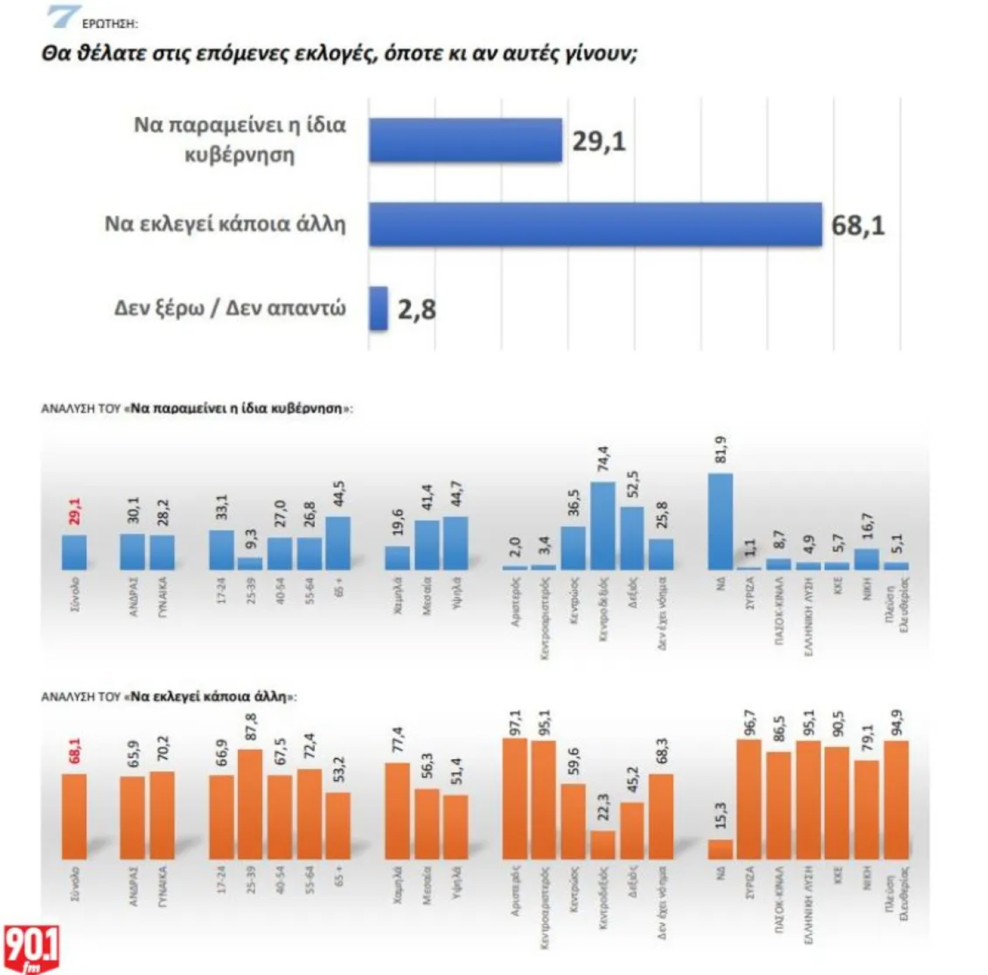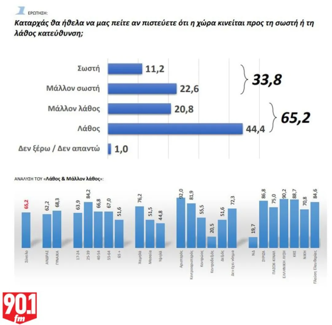 Το 65,2% του συνόλου θεωρεί ότι η χώρα κινείται προς τη λάθος κατεύθυνση έναντι 33,8% που πιστεύει ότι πορεύεται προς τη σωστή, με τις απαντήσεις να έχουν σαφέστατη κομματική συσχέτιση, αφού θετικά κρίνουν την πορεία της χώρας το 79,5% των ψηφοφόρων της ΝΔ και αρνητικά σε ποσοστά άνω του 80% οι ψηφοφόροι των υπόλοιπων κομμάτων.