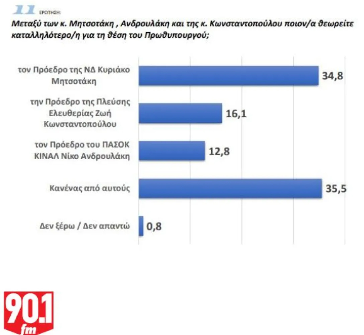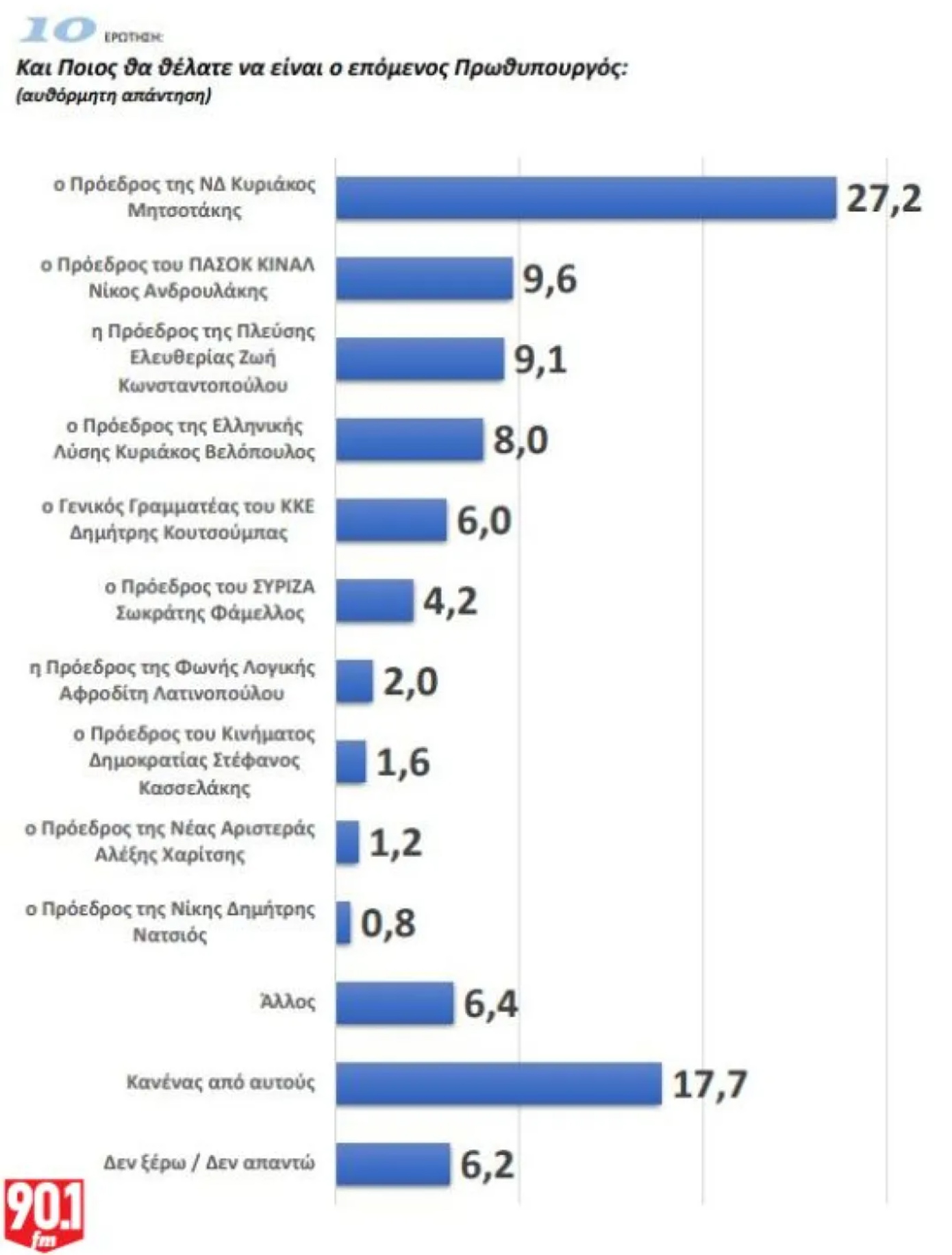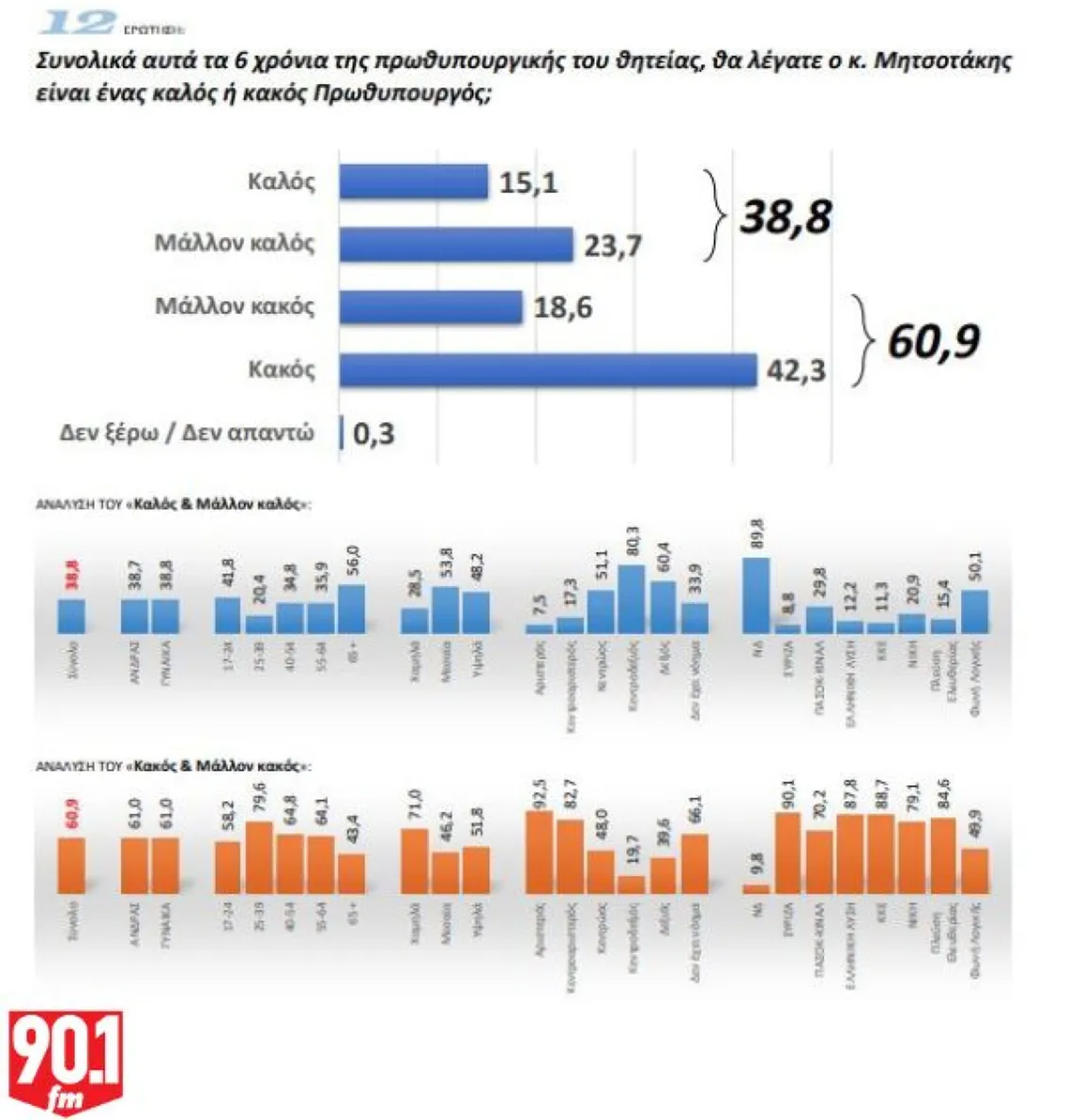 Ο Κυριάκος Μητσοτάκης διατηρεί μία σημαντική απόσταση από τους πολιτικούς του αντιπάλους που δεν μπορούν να διευρύνουν την επιρροή τους πέρα από τα στενά κομματικά όρια, ενώ η συνολική αποτίμηση για τα 6 χρόνια της πρωθυπουργικής θητείας του κ. Μητσοτάκη αποτυπώνεται θετικά για το 38,8% του εκλογικού σώματος που τον θεωρεί έναν καλό και μάλλον καλό πρωθυπουργό έναντι 60,9% που αξιολογεί την παρουσία του ως κακή και μάλλον κακή. Η συγκεκριμένη αναλογία αντικατοπτρίζει έως έναν βαθμό το αποτέλεσμα των τελευταίων εθνικών εκλογών και πολιτικά είναι μάλλον ευνοϊκή για τον ίδιο τον Κυριάκο Μητσοτάκη.