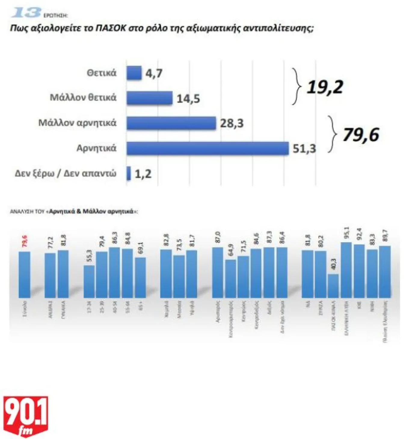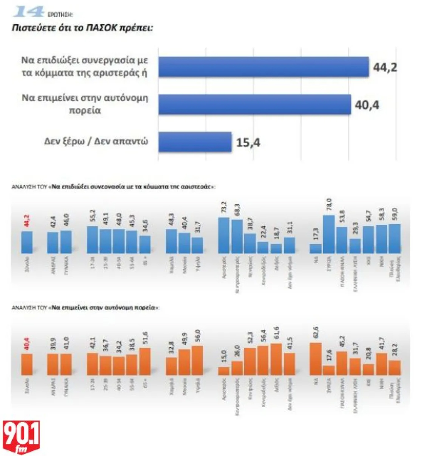 Αρνητική αξιολόγηση από το 79,6% του συνόλου για την αντιπολιτευτική παρουσία του ΠΑΣΟΚ, που συνεχίζει να βρίσκεται εγκλωβισμένο στο δίλημμα συνεργασία ή αυτόνομη πορεία, με το 44,2% να προκρίνει τη συμπόρευση με τα υπόλοιπα κόμματα της προοδευτικής αριστεράς και το 40,4% να διαλέγει το δρόμο της αυτόνομης πορείας. Το δίλημμα εμφανίζεται ισχυρό και μεταξύ των ψηφοφόρων του κόμματος, με το 53,8% να τοποθετείται υπέρ της συνεργασίας και το 45,2% υπέρ της αυτόνομης παρουσίας του κινήματος.