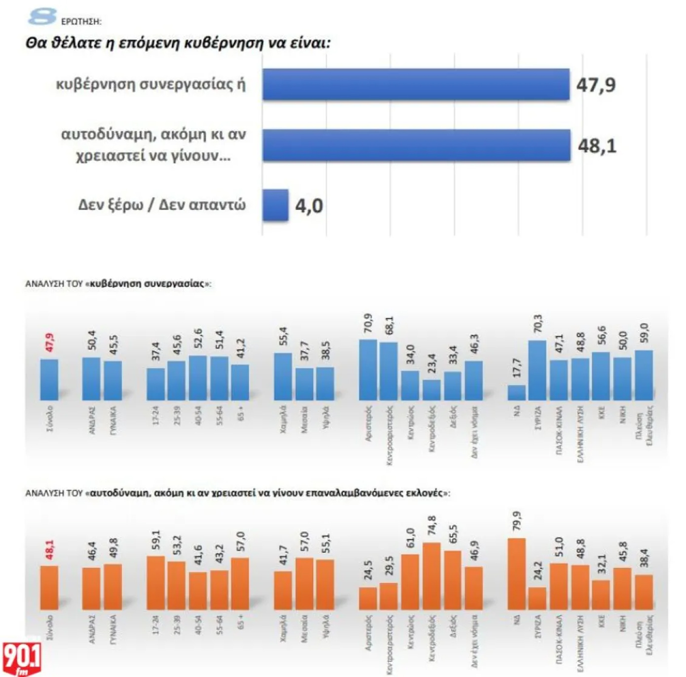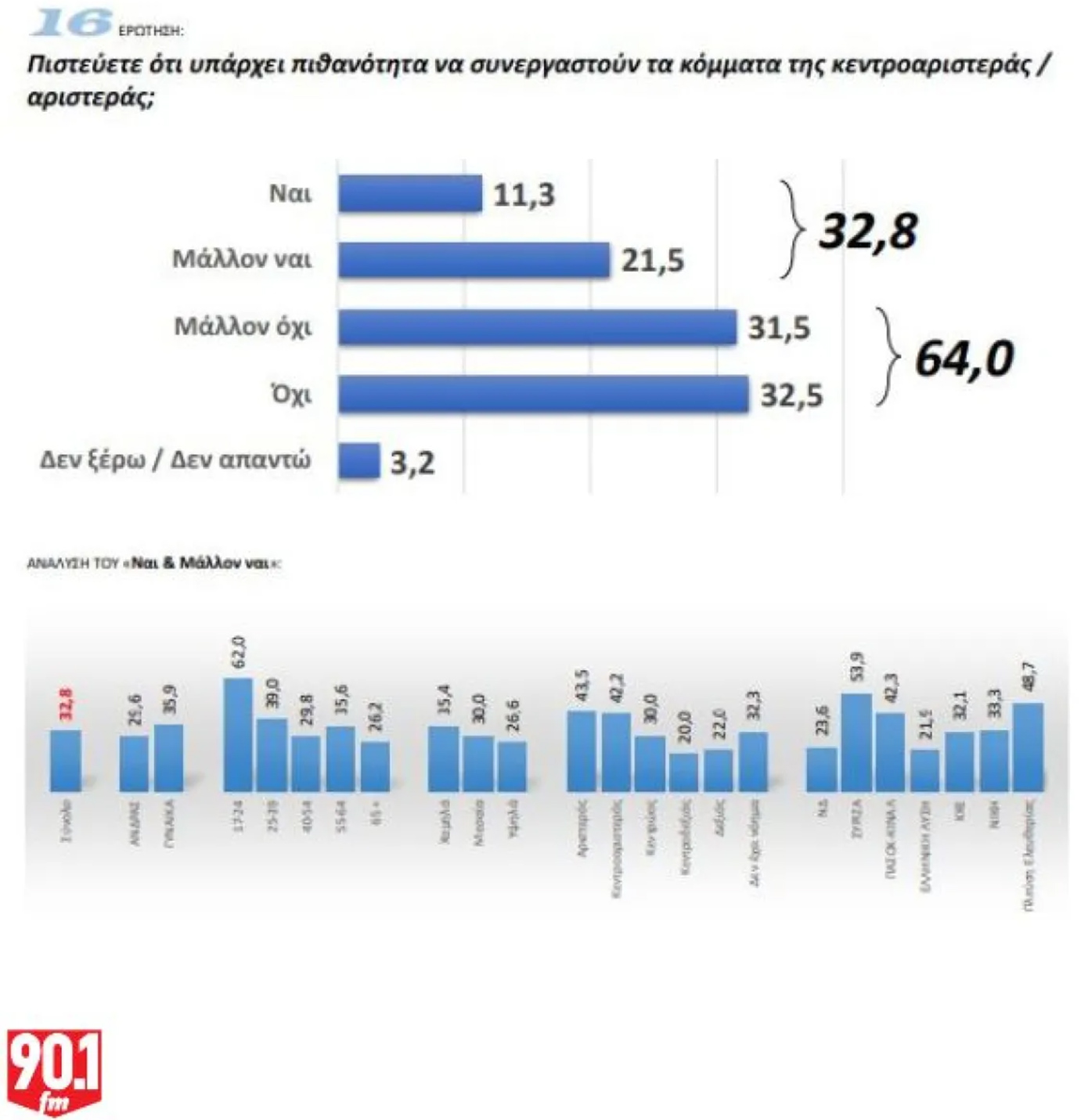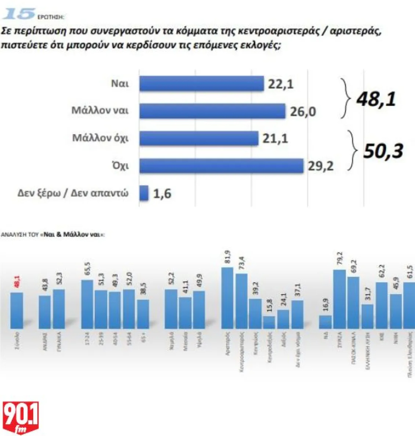 Άλλωστε, το 48,1% του γενικού πληθυσμού και κυρίως οι ψηφοφόροι του ΣΥΡΙΖΑ, του ΠΑΣΟΚ, του ΚΚΕ και της Πλεύσης Ελευθερίας θεωρούν τη συνεργασία των κομμάτων της Κεντροαριστεράς ως το μόνο σχήμα που μπορεί να έχει πιθανότητες νίκης στις επόμενες εκλογές, ένα ενδεχόμενο ωστόσο μάλλον θεωρητικό, αφού μόνο το 32,8% πιστεύει ότι μπορεί μία τέτοιου είδους συνεργασία να πάρει σάρκα και οστά στο επόμενο διάστημα.